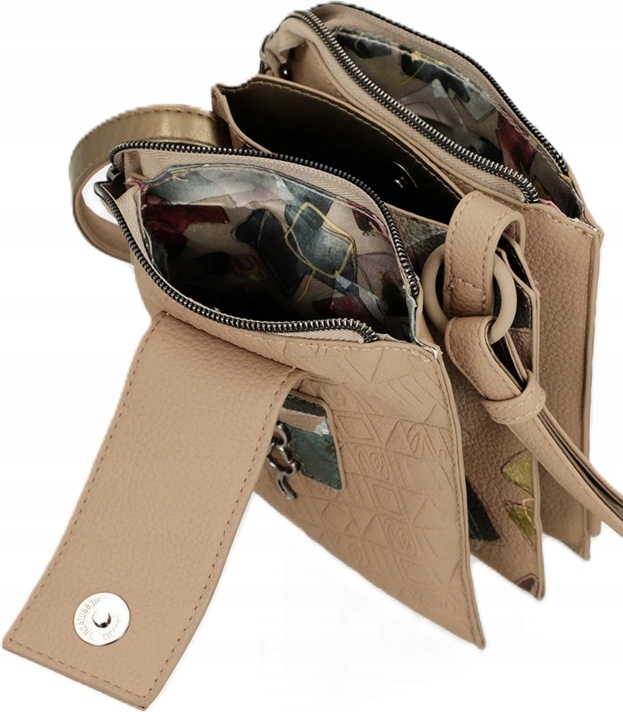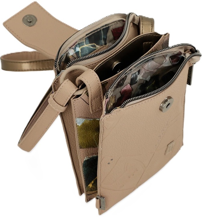 Torebka zachwyca starannością wykonania – wewnątrz znajdziesz 3 samodzielne komory zamykane na suwak lub zamek magnetyczny. Wnętrze wykończone jest podszewką w naturalnych tonacjach nawiązujących do estetyki serii Anekke Evolution, co podkreśla spójność stylu i dbałość o detale. Dzięki regulowanemu paskowi torebkę możesz wygodnie nosić na ramieniu lub jako crossbody.