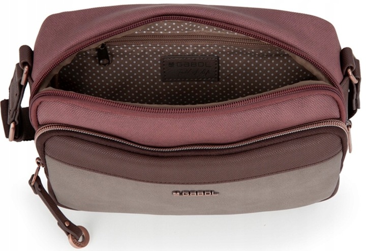 lekka torebka listonoszka Gabol Dora posiada 1 komorę zamykana zamkiem błyskawicznym wyposażona jest w kieszonkę zamykaną suwakiem oraz 2 dodatkowe kieszenie zewnętrzne zamykane zamkiem błyskawicznym; do przenoszenia służy mocowany na stałe pasek.