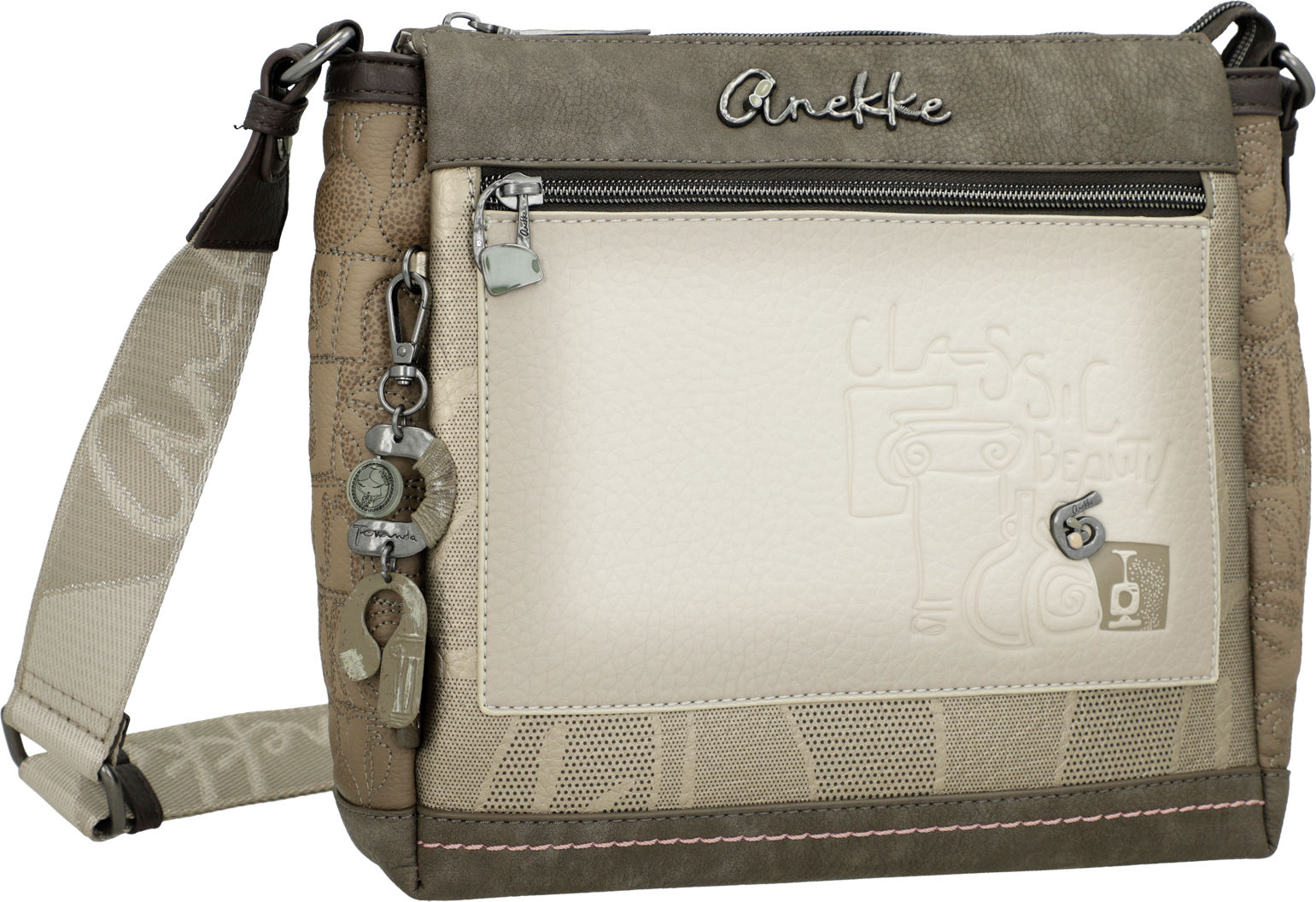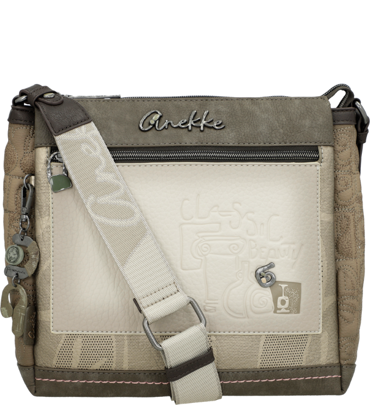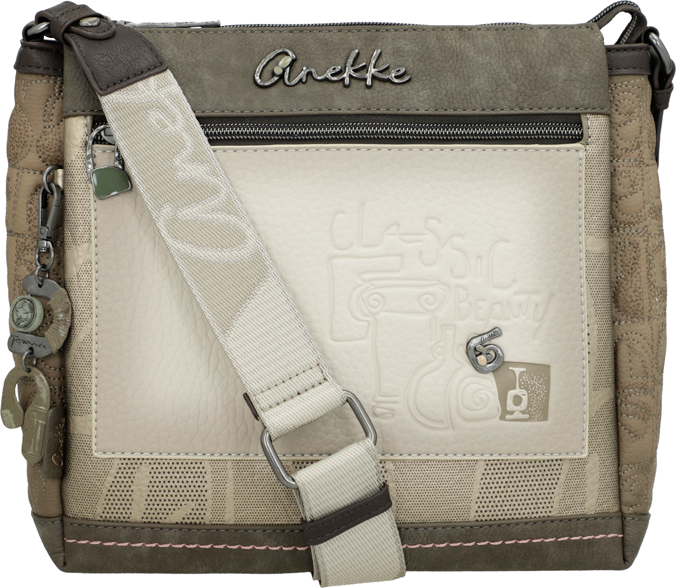 Klasyczna listonoszka Anekke Amphora trzykomorowa. Wnętrze to syntetyczna podszewka kolorystyką nawiązująca do naturalnych barw wnętrza ziemi. Trzy komory zamykane są zamkiem błyskawicznym, wnętrze zawiera trzy kieszonki: dwie otwarte i jedna zamykana zamkiem. Pojemna trzykomorowa torebka listonoszka do noszenia na ramieniu lub na skos z kolekcji Anekke Amphora. Dzięki regulowanemu paskowi możemy ją nosić na ramieniu, lub na skos. Zakres regulacji to od 70 do 140 cm. Ta zgrabna torebka posiada trzy komory, z których każda zamykana jest od góry na zamek. Wewnątrz komory środkowej, znajduje się jedna zamykana na zamek kieszonka na dokumenty, jedna kieszeń otwarta i przegródka na telefon komórkowy. Dodatkowa zamykana kieszeń znajduje się z tyłu torebki.