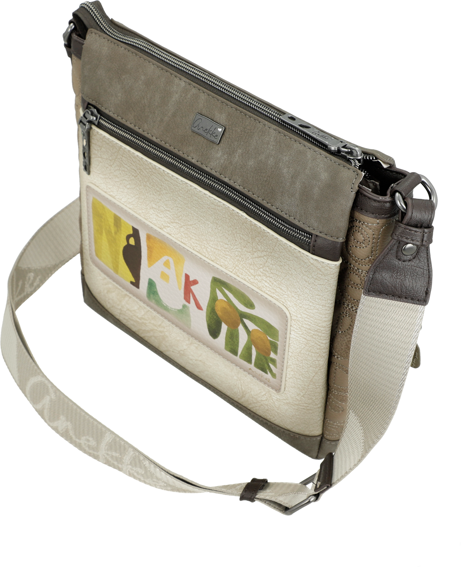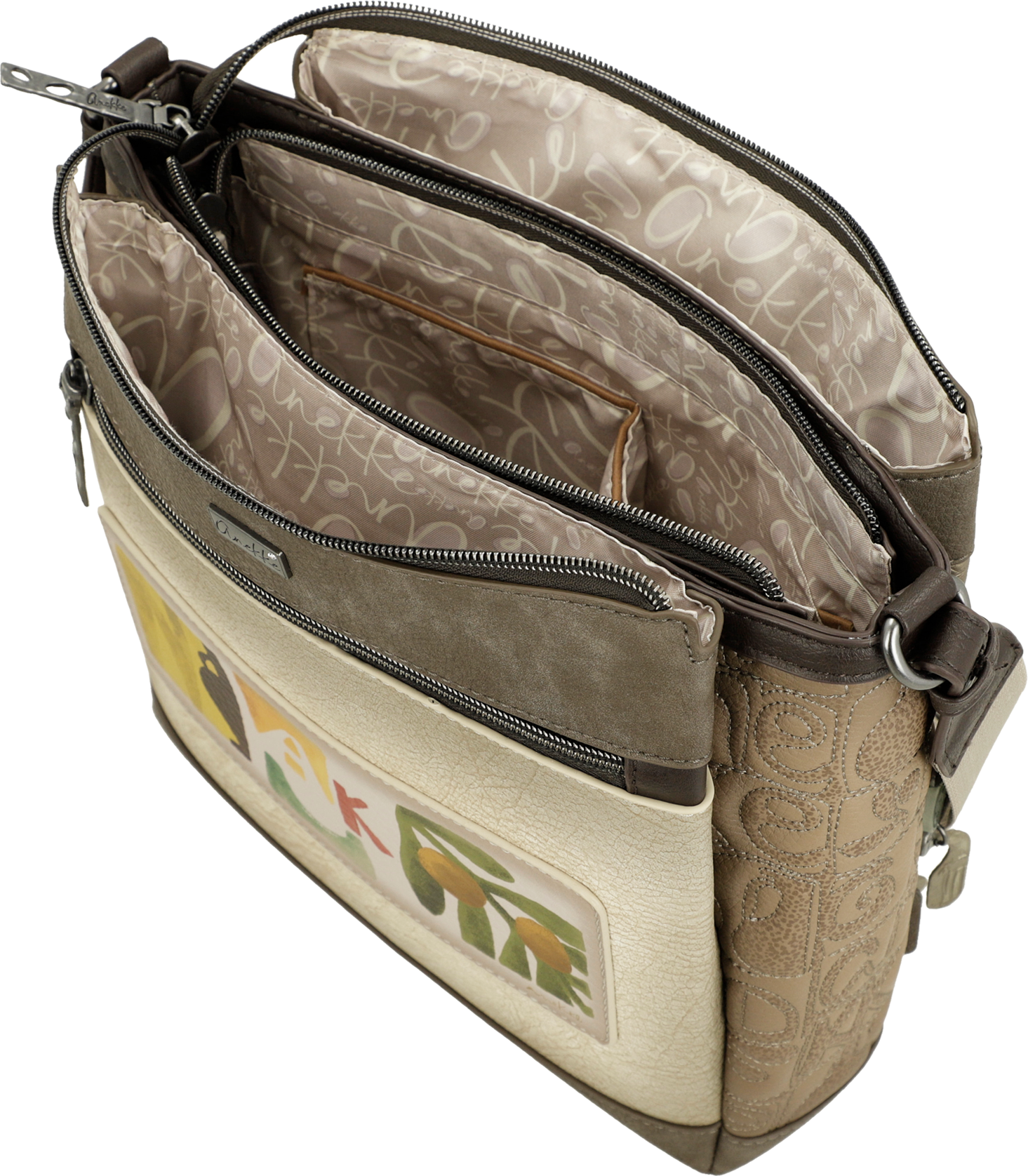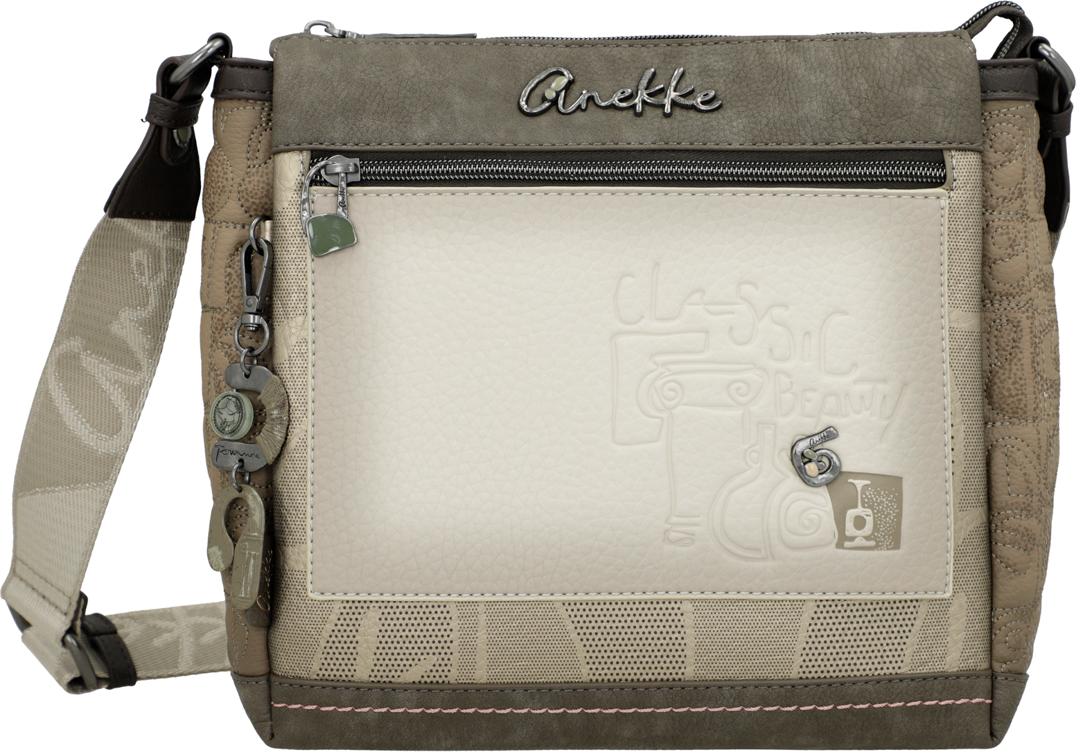 Klasyczna listonoszka Anekke Amphora trzykomorowa. Wnętrze to syntetyczna podszewka kolorystyką nawiązująca do naturalnych barw wnętrza ziemi. Trzy komory zamykane są zamkiem błyskawicznym, wnętrze zawiera trzy kieszonki: dwie otwarte i jedna zamykana zamkiem. Pojemna trzykomorowa torebka listonoszka do noszenia na ramieniu lub na skos z kolekcji Anekke Amphora. Dzięki regulowanemu paskowi możemy ją nosić na ramieniu, lub na skos. Zakres regulacji to od 70 do 140 cm. Ta zgrabna torebka posiada trzy komory, z których każda zamykana jest od góry na zamek. Wewnątrz komory środkowej, znajduje się jedna zamykana na zamek kieszonka na dokumenty, jedna kieszeń otwarta i przegródka na telefon komórkowy. Dodatkowa zamykana kieszeń znajduje się z tyłu torebki.