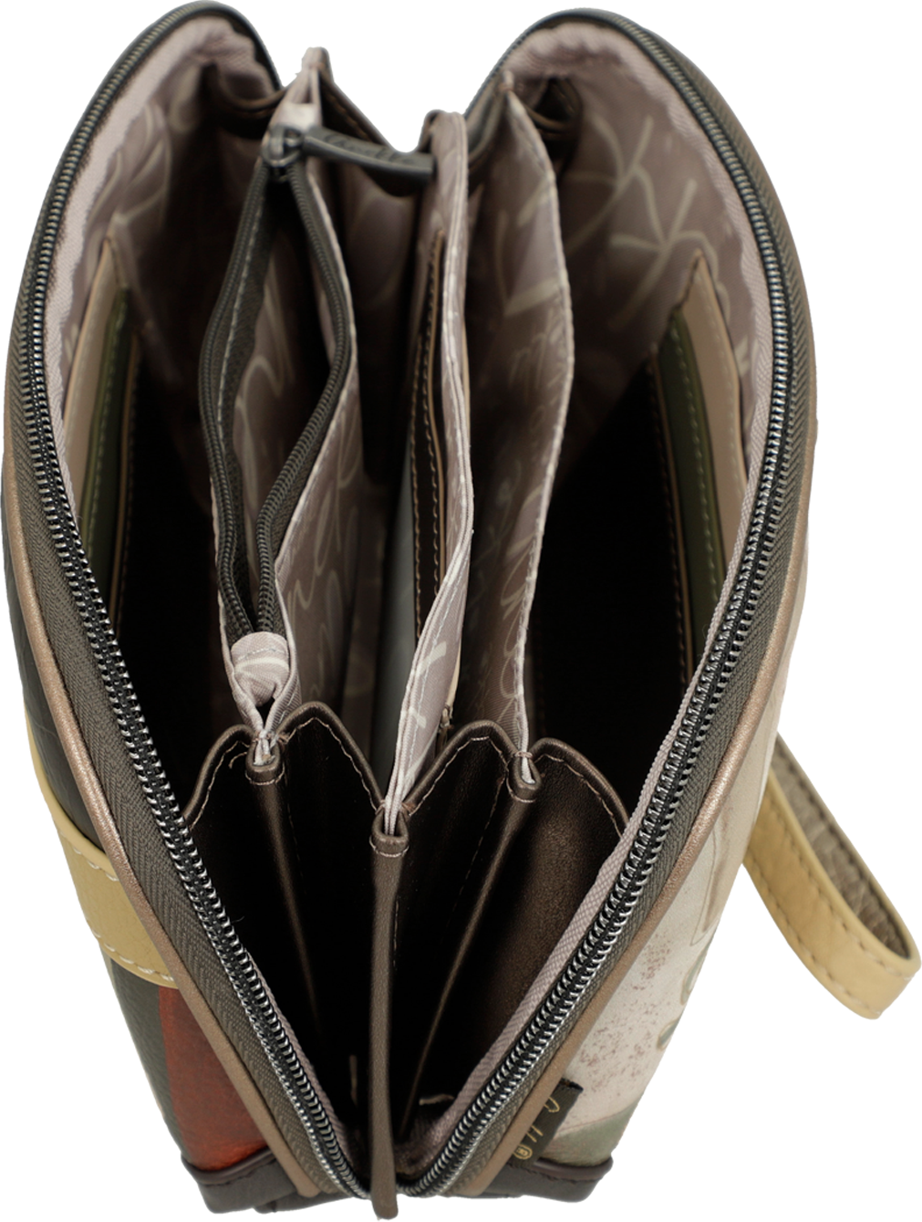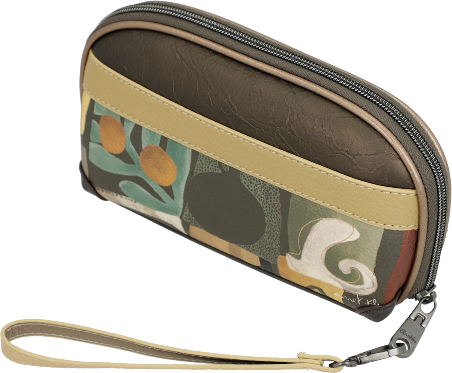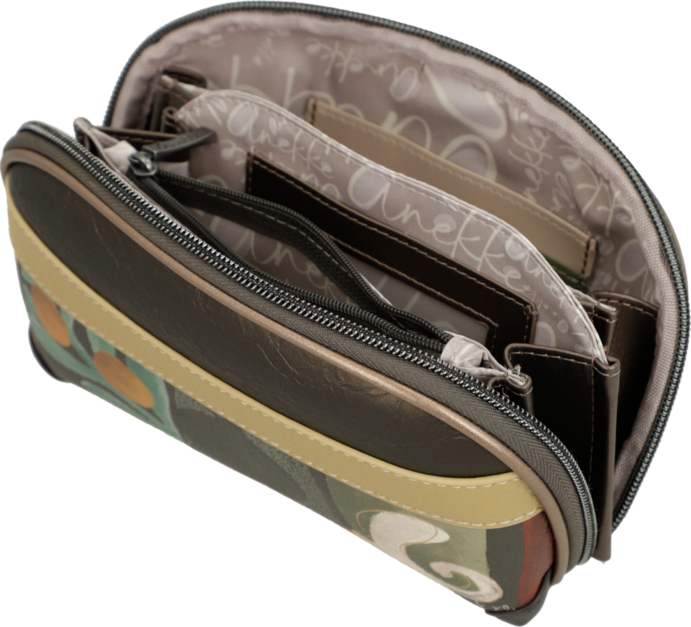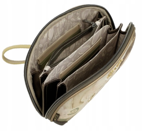 Duży portfel, etui, torebka lub kosmetyczka Anekke Muse zamykany jest ozdobnym zamkiem błyskawicznym i obszyty jest wielokolorową podszewką z florystycznymi motywami nawiązującym do serii Anekke Muse. Etui Anekke Muse może pełnić funkcję kosmetyczki, rozbudowanego portfela lub torebki wizytowej (do zameczka dołączony jest wygodny pasek na rękę). Portfel składa się z czterech obszernych przegród, z których każda wyposażona jest w kieszonki na karty (9 kieszonek) lub zdjęcia (1 szt). Jedna z kieszonek portfela Anekke Muse zamykana jest na zamek błyskawiczny i może pełnić funkcje kieszonki na bilon.