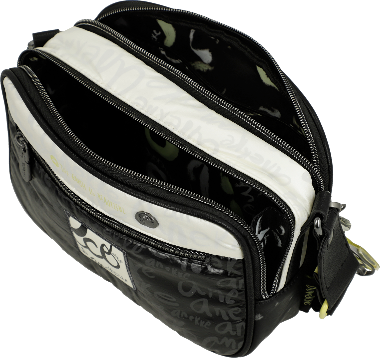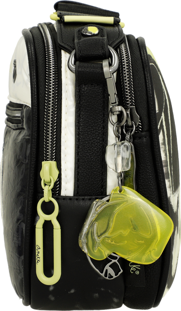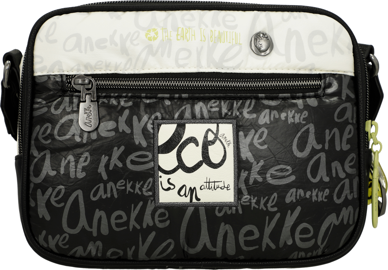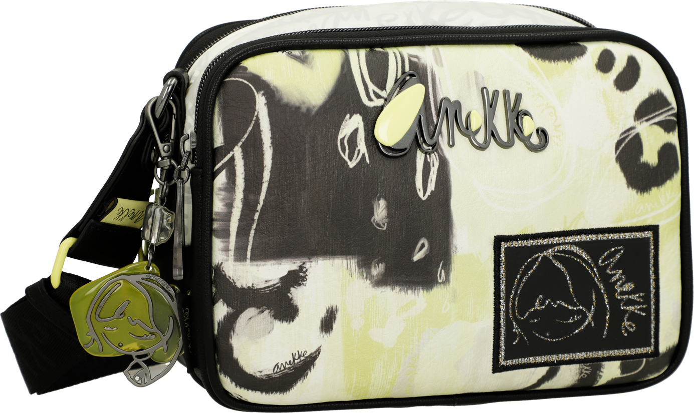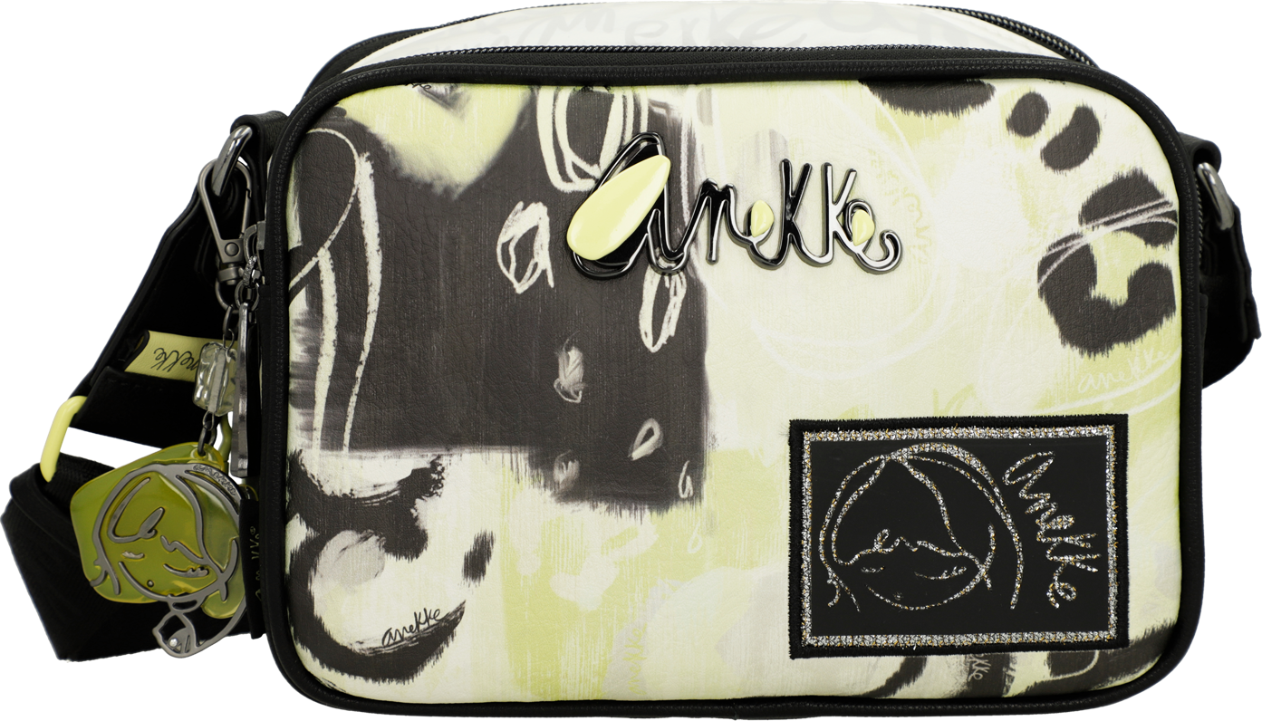 dwukomorowa niewielkiej wielkości listonoszka Anekke Memories Nature wyposażona jest w regulowany szeroki tkany pasek. Torebka posiada 3 kieszenie: 2 wewnętrzne, w tym jedna zamykana suwakiem oraz zewnętrzna bezpieczna kieszonka zamykana zamkiem błyskawicznym. Torebka jest dwustronna: można ją nosić zarówno po stronie z limonkowym nadrukiem oraz emblematem Anekke, jak i po spokojniejszej stronie w tonacji czarno szarej. Ozdobą są naszywki, dżety oraz emblematy związane z tematyką serii, a także odpinany brelok z wizerunkiem Anekke.