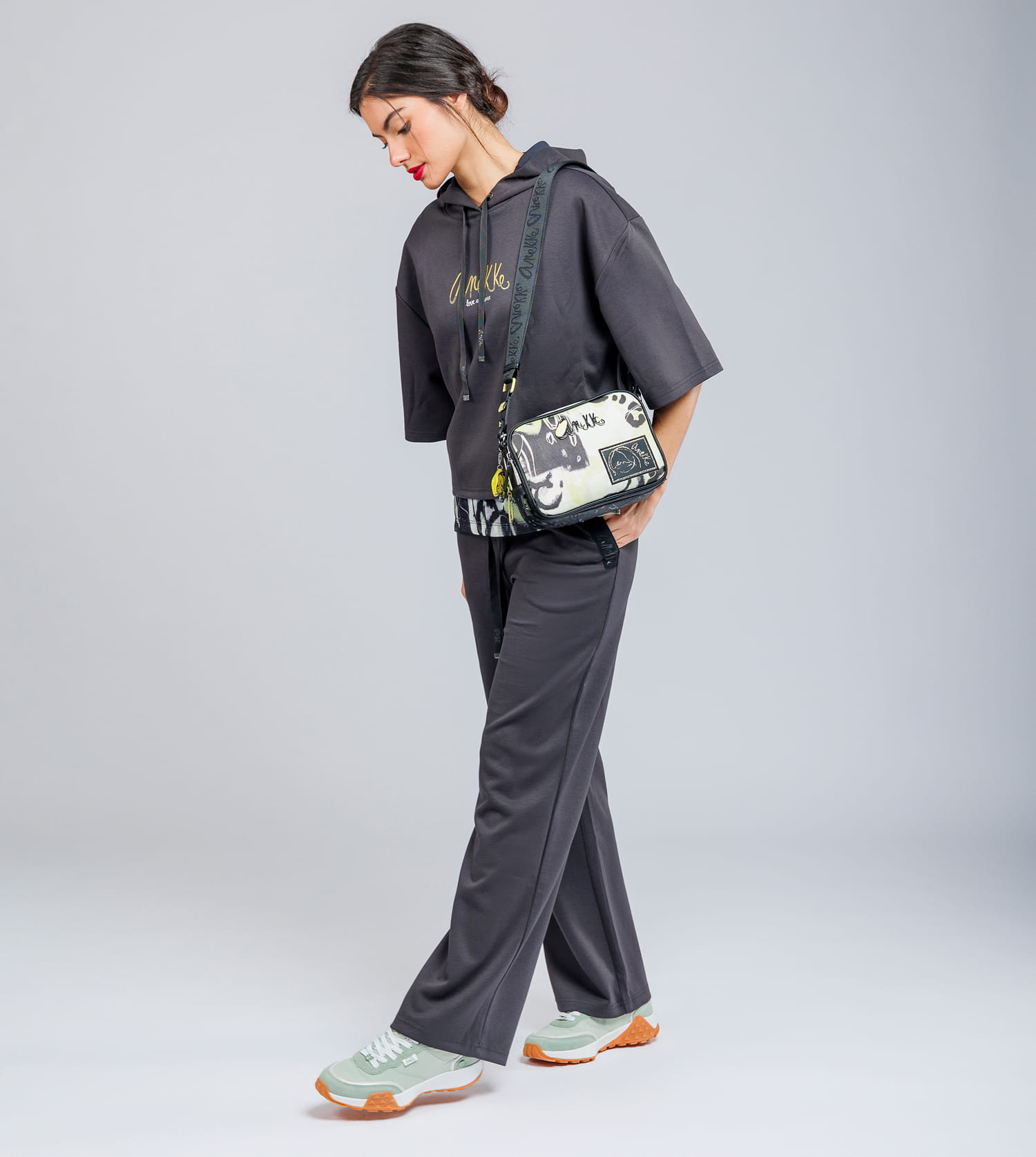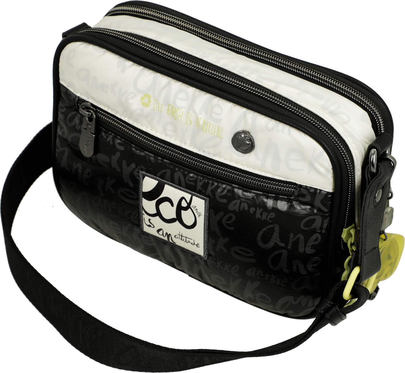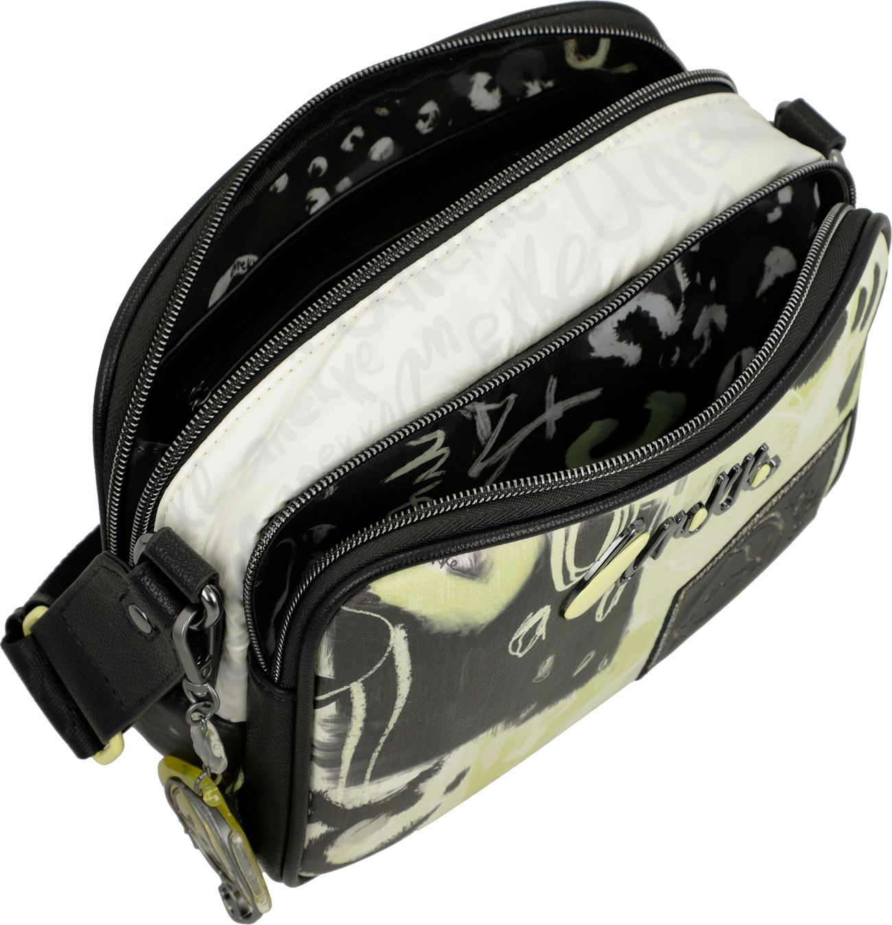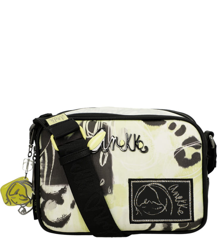 dwukomorowa niewielkiej wielkości listonoszka Anekke Memories Nature wyposażona jest w regulowany szeroki tkany pasek. Torebka posiada 3 kieszenie: 2 wewnętrzne, w tym jedna zamykana suwakiem oraz zewnętrzna bezpieczna kieszonka zamykana zamkiem błyskawicznym. Torebka jest dwustronna: można ją nosić zarówno po stronie z limonkowym nadrukiem oraz emblematem Anekke, jak i po spokojniejszej stronie w tonacji czarno szarej. Ozdobą są naszywki, dżety oraz emblematy związane z tematyką serii, a także odpinany brelok z wizerunkiem Anekke.