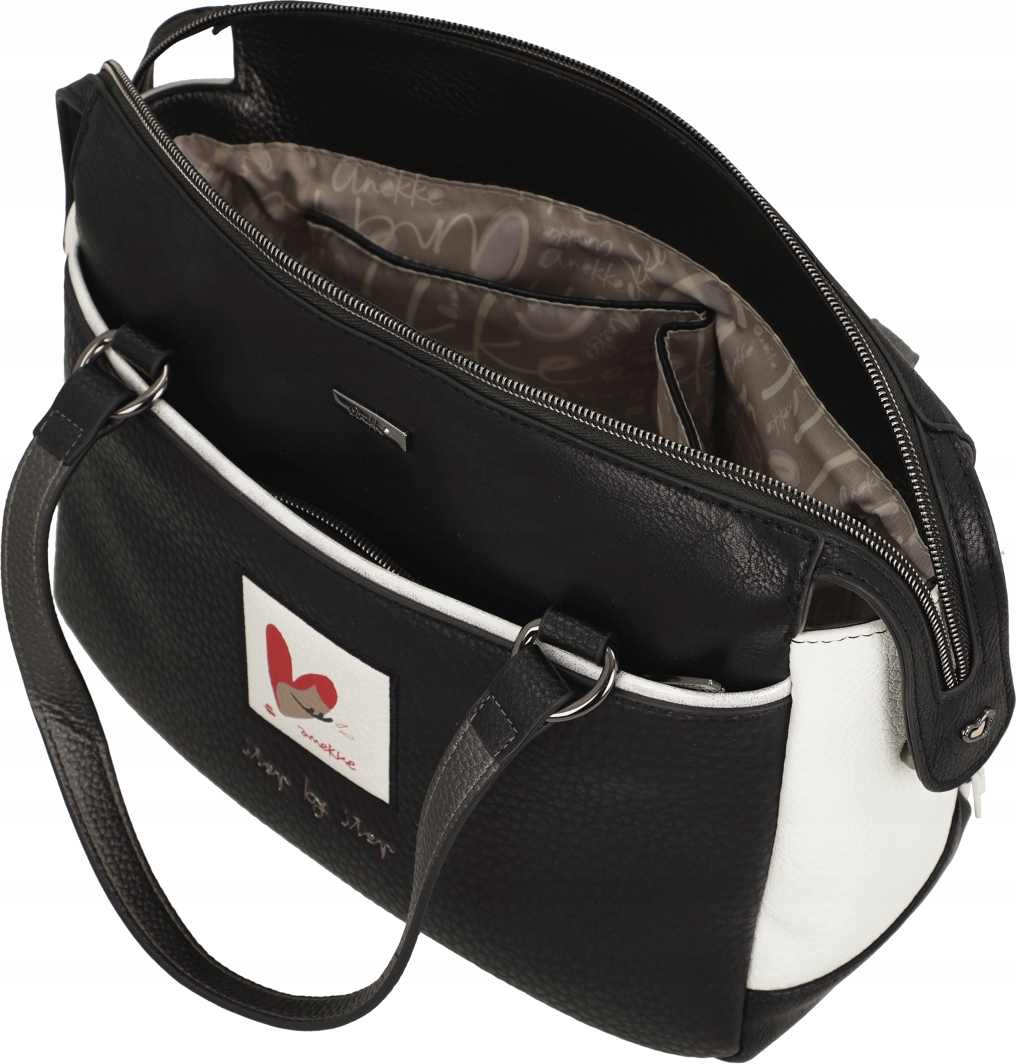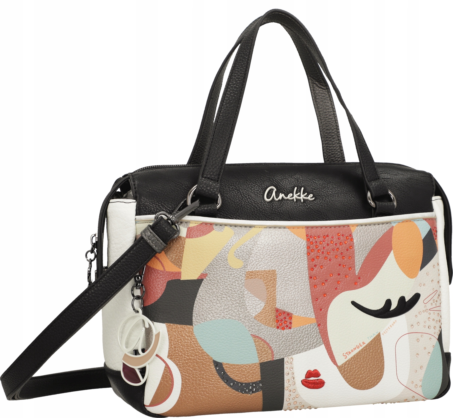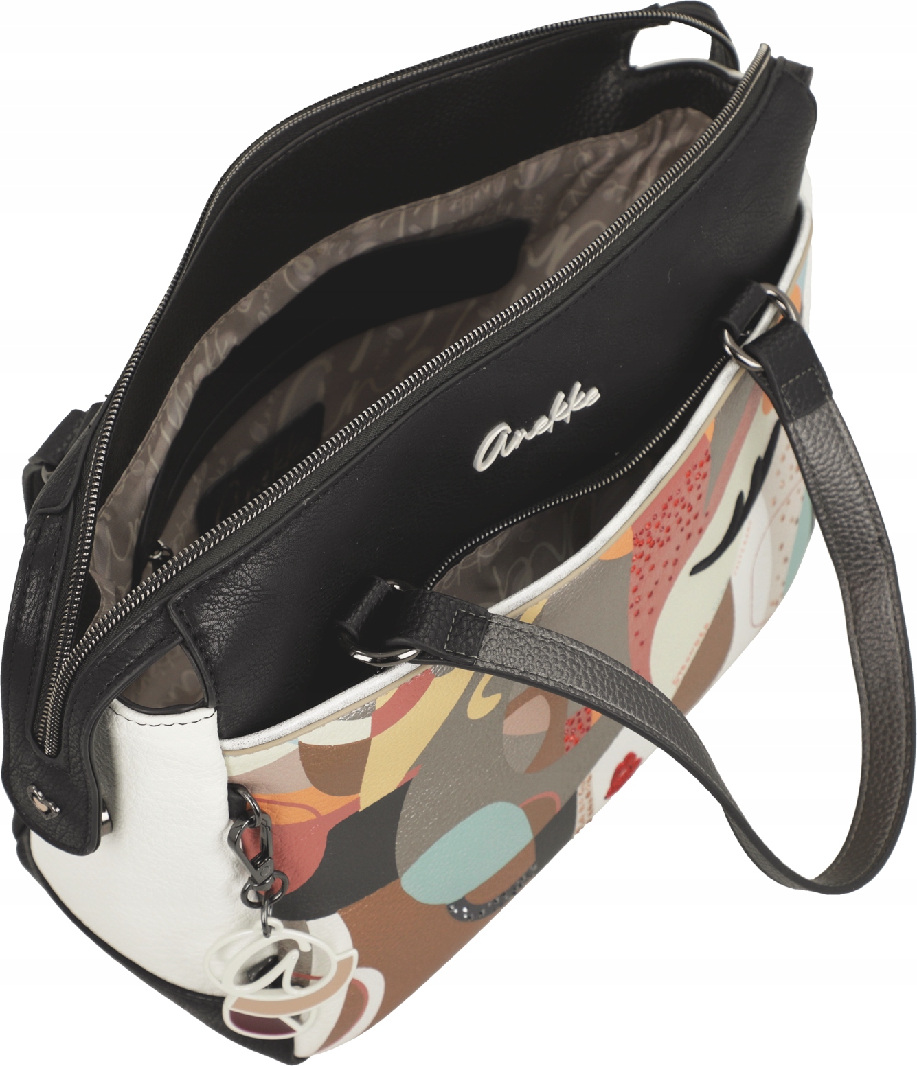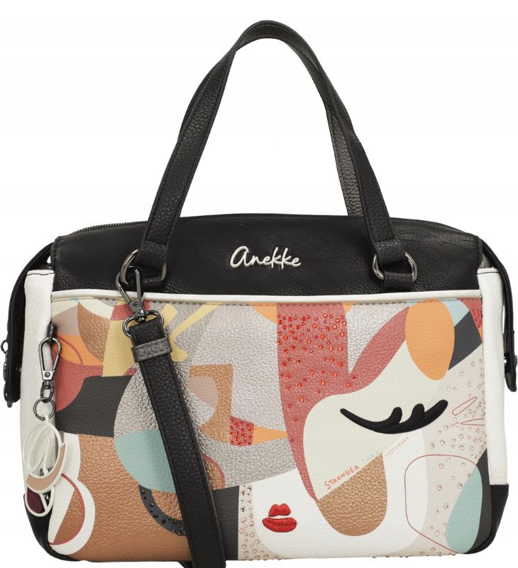 Jednokomorowa Torebka Anekke Muse Eikon zamykana jest na zamek błyskawiczny. Wnętrze torebki wykończone jest tkaniną kaletniczą z kolorowym nadrukiem nawiązującym do serii Anekke Muse Eikon. Wewnątrz głównej komory umieszczono trzy kieszenie, z których jedna zamykana jest na suwak, dwie są otwarte. Na zewnątrz, z obu stron torebki Anekke znajdują się dwie płaskie, zamykane ukrytymi zamkami błyskawicznymi kieszenie. Do przenoszenia torebki Anekke Muse Eikon w ręku służą dwa krótkie uchwyty. Po zamocowaniu odpinanego, wąskiego paska, możemy nosić torebkę na ramieniu, jak listonoszkę lub klasyczną torebkę na krótszym uchwycie. Regulowany pas ma długość ok 130 cm.