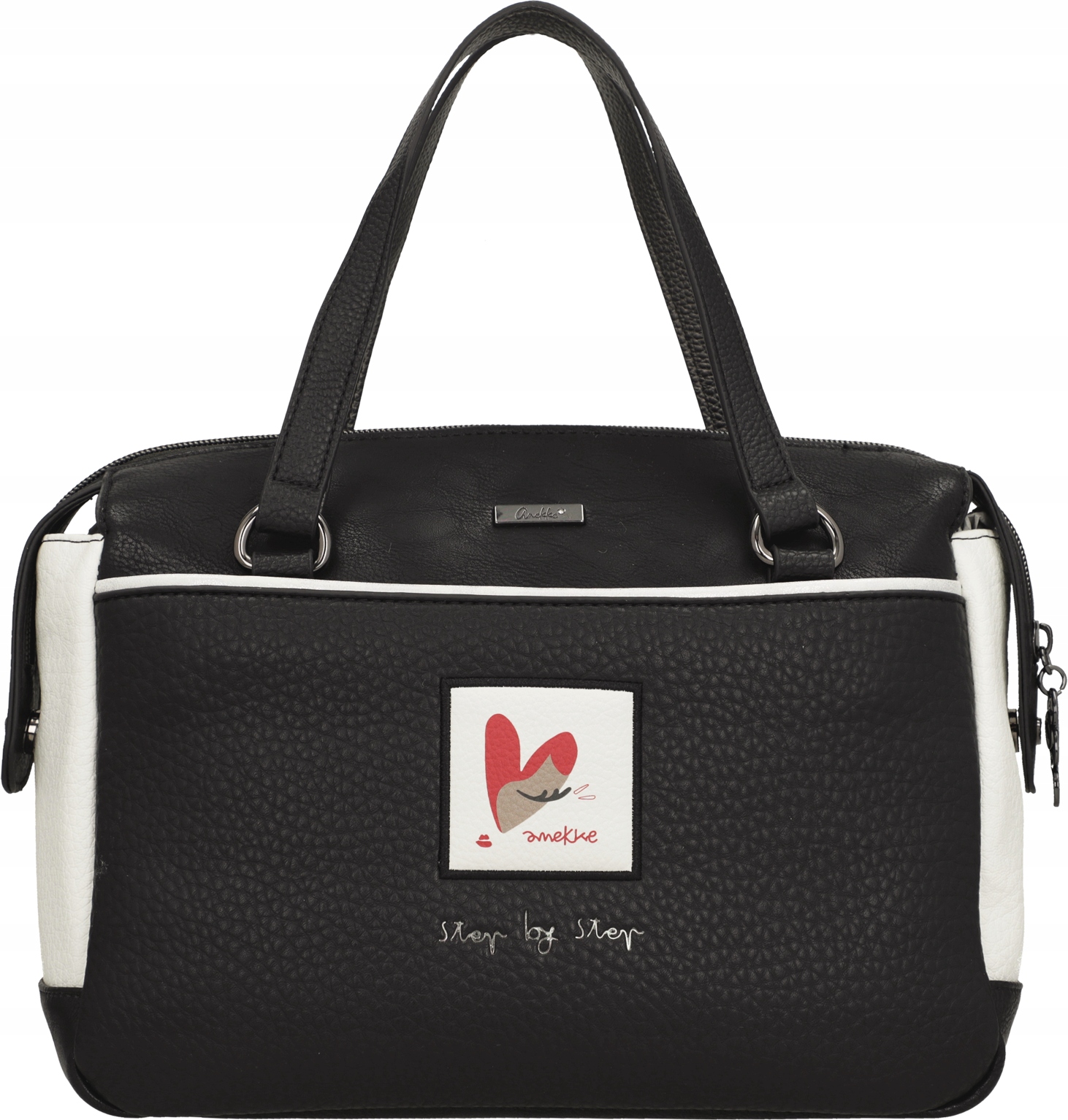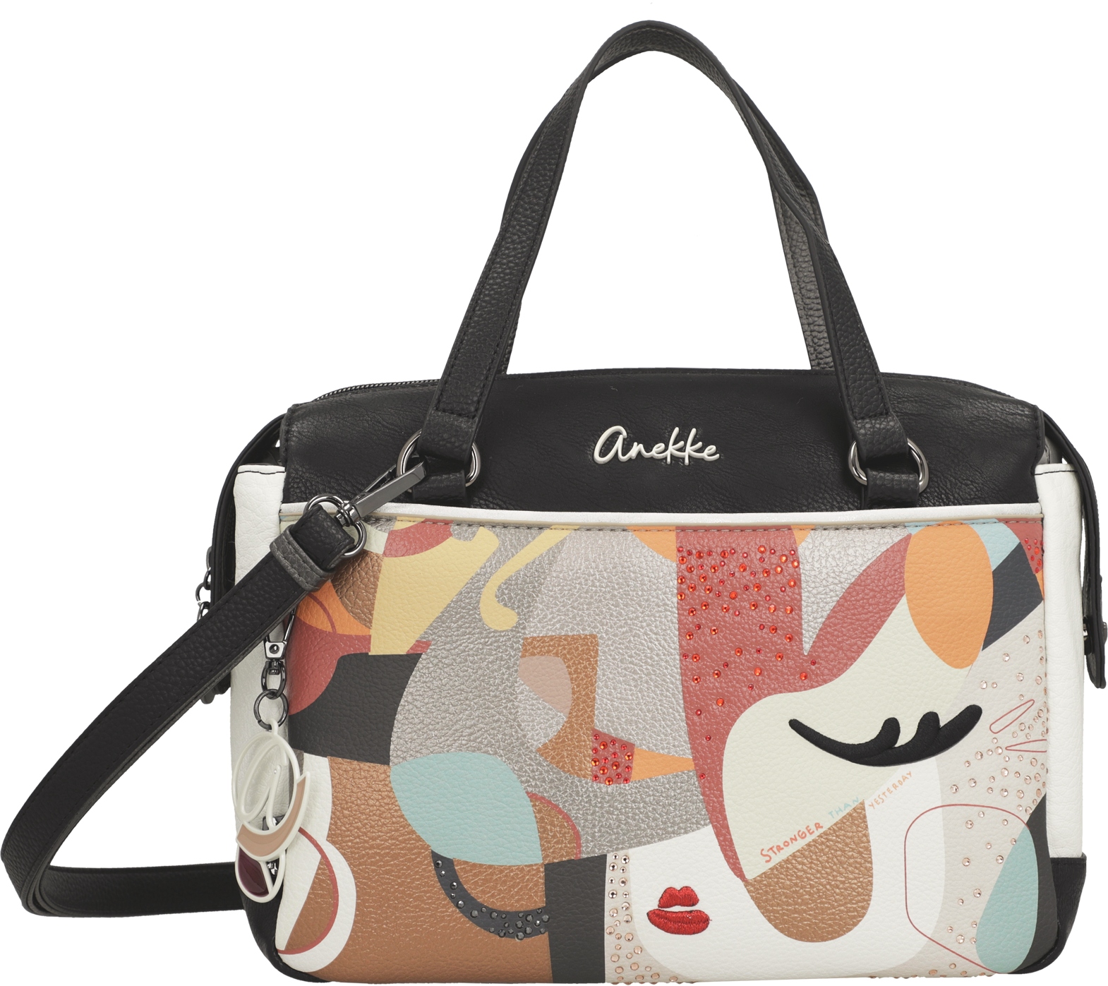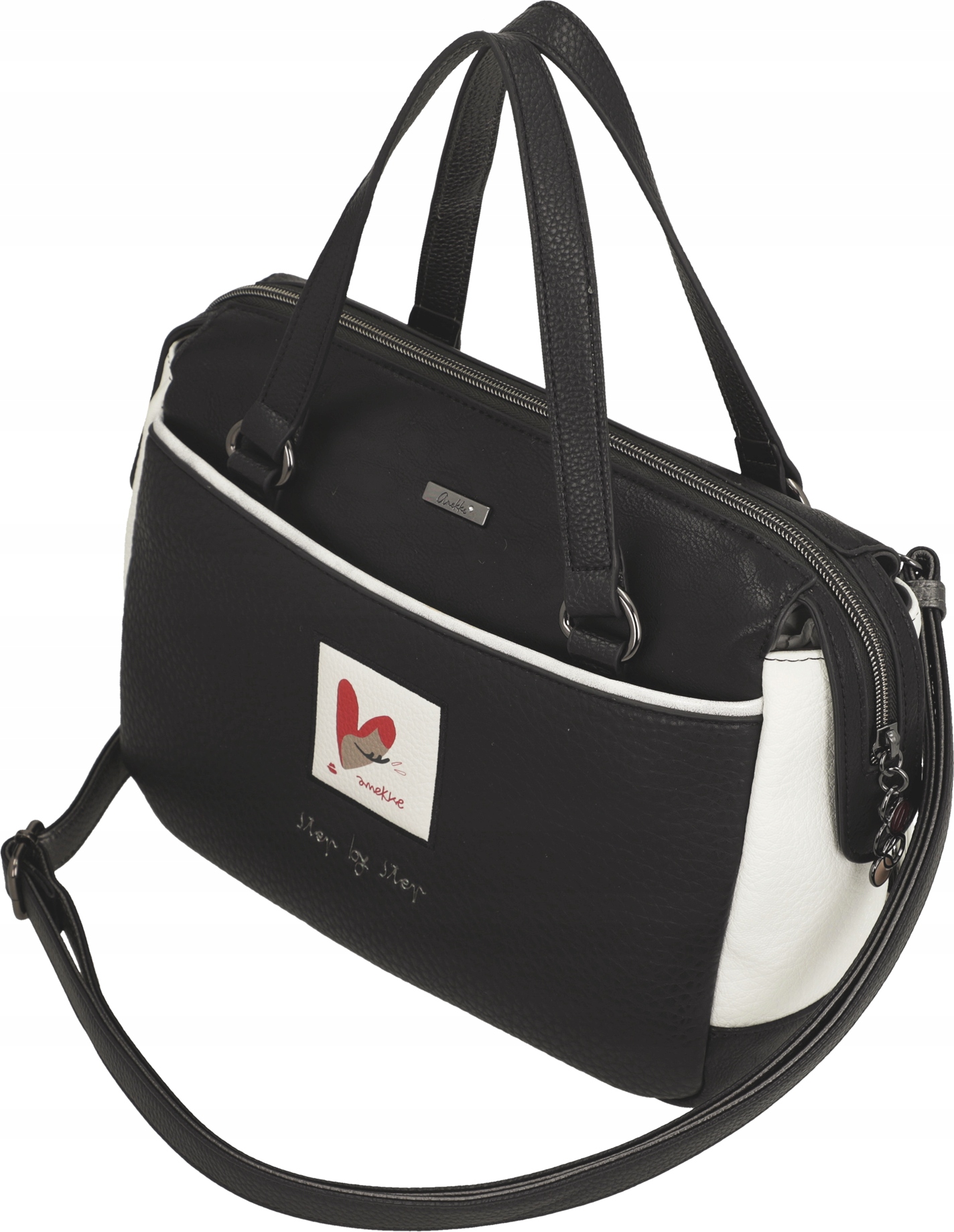 Jednokomorowa Torebka Anekke Muse Eikon zamykana jest na zamek błyskawiczny. Wnętrze torebki wykończone jest tkaniną kaletniczą z kolorowym nadrukiem nawiązującym do serii Anekke Muse Eikon. Wewnątrz głównej komory umieszczono trzy kieszenie, z których jedna zamykana jest na suwak, dwie są otwarte. Na zewnątrz, z obu stron torebki Anekke znajdują się dwie płaskie, zamykane ukrytymi zamkami błyskawicznymi kieszenie. Do przenoszenia torebki Anekke Muse Eikon w ręku służą dwa krótkie uchwyty. Po zamocowaniu odpinanego, wąskiego paska, możemy nosić torebkę na ramieniu, jak listonoszkę lub klasyczną torebkę na krótszym uchwycie. Regulowany pas ma długość ok 130 cm.