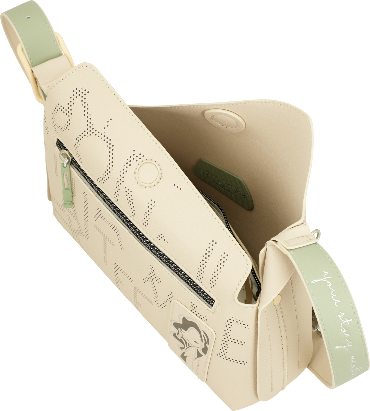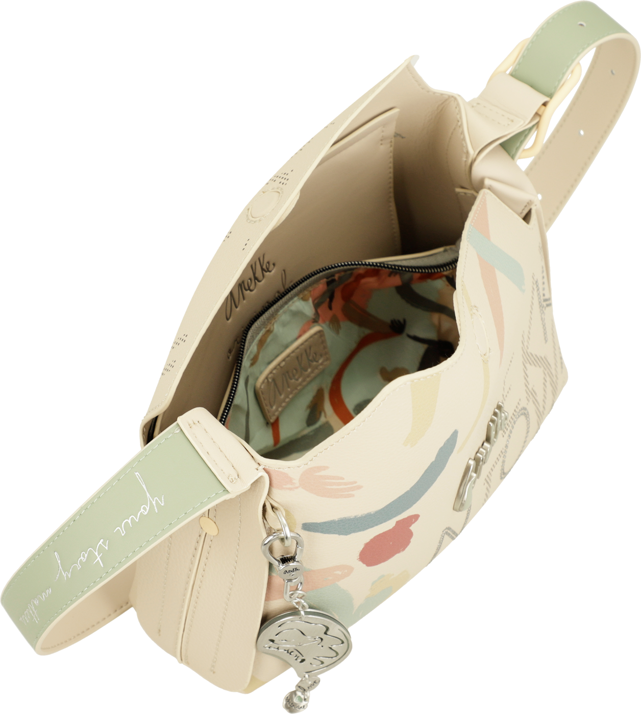 Jednokomorowa, zgrabna torebka z oryginalnym zamykaniem Anekke Alma Original wyposażona jest w regulowany pasek. Wnętrze obszyte podszewką ze wzorami nawiązującymi do tematyki serii, wyposażone jest w 1 zamykaną zamkiem błyskawicznym kieszonkę. Na zewnątrz wszyta została kieszeń bezpieczna zasuwana zamkiem. Ozdobą oryginalnej torebki jest odpinany brelok oraz hafty dżety, naszywki ze wzorami łączącymi się z tematyką serii Anekke Alma Original