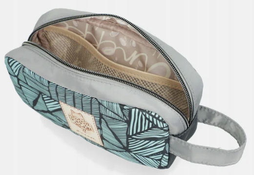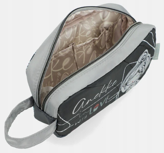 Oryginalna kosmetyczka damska od Anekke z kolekcji Gaia. Kosmetyczka posiada krótką rączkę do trzymania w ręku. Zamykana na zamek błyskawiczny, wyposażona w jedną komorę. Wnętrze wyściełane kolorową podszewką. W środku znajdziesz jedną kieszonkę z siateczki oraz trzy otwarte kieszonki.