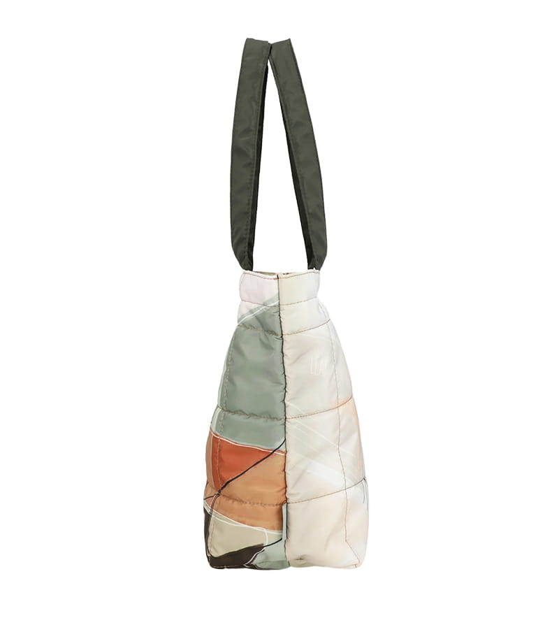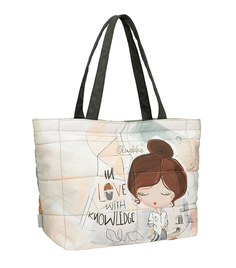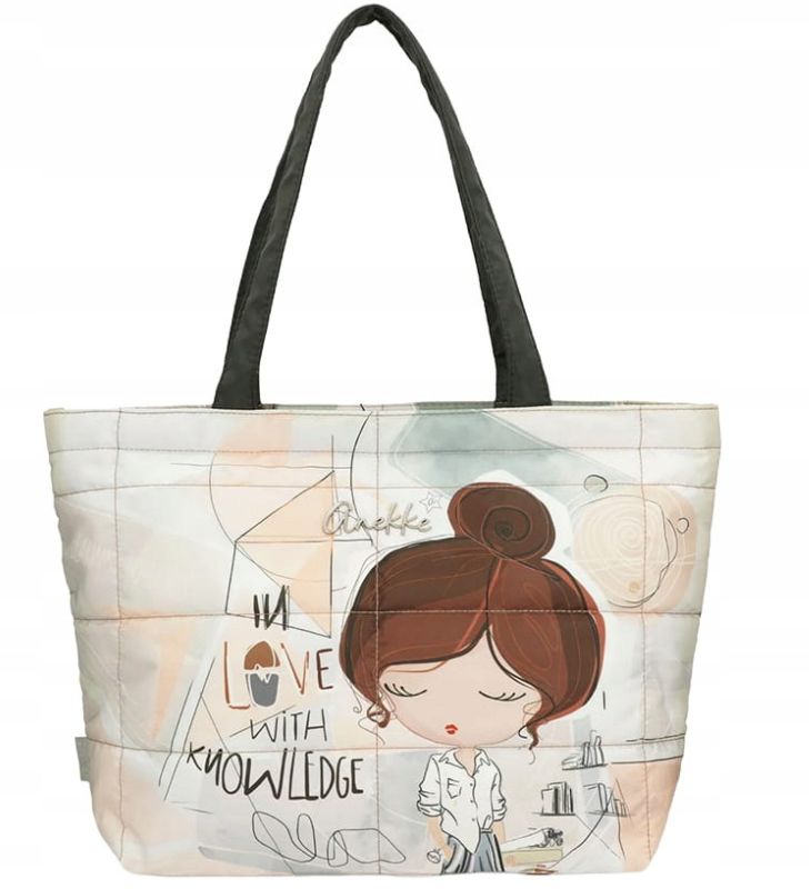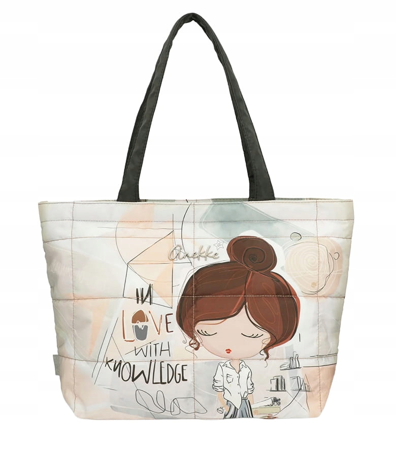 Torba wykonana została z wysokiej jakości, miękkich i wytrzymałych materiałów, które zapewniają komfort użytkowania i trwałość. Na froncie znajduje się artystyczny nadruk przedstawiający kobiecą sylwetkę, jakby wyjętą z greckiej historii. Dopełniają go detale w formie znaczków, haftów i aplikacji, które tworzą kolaż mody i kreatywności.