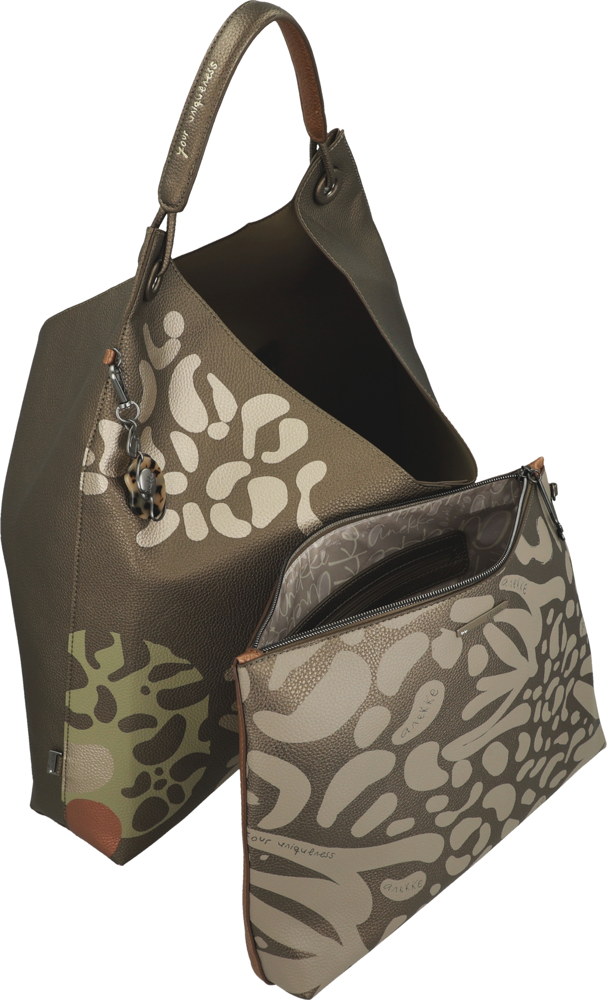 Torebka Anekke Gaia składa się z dużego, miękkiego worka na ramię w stylu boho oraz umieszczonej w jego wnętrzu mniejszej wkładki – torebki pełniącej funkcję kosmetyczki. Dzięki temu zyskujesz dużą, pojemną przestrzeń na co dzień oraz mniejszą, bezpiecznie zamykaną część na najważniejsze drobiazgi. Wewnętrzna wkładka zapinana jest na zamek błyskawiczny, co zapewnia wygodę i bezpieczeństwo przechowywania.