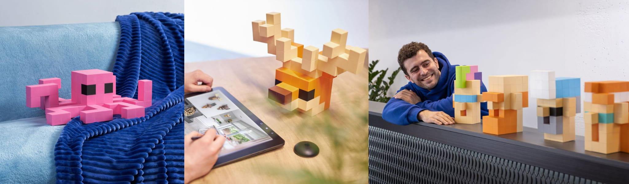 Istnieją dwa rodzaje zestawów VOXART - Collections i Freestyles. W Collections liczba i kolory kafelków są wybierane tak, aby można było ich użyć do stworzenia konkretnej sztuki (głowa zwierzęcia, potwór, kwiat).W Freestyles liczba i kolory kafelków są dobierane proporcjonalnie, w wielokrotnościach 100.Zabawka, dekoracja, rozrywka, łamigłówka — VOXART będzie tym, co z niego zrobisz. Łatwy do kliknięcia quadrolock, lekka konstrukcja, możliwość ponownego złożenia sztuki i aplikacja z setkami inspirujących dzieł sztuki, które można powielać w prawdziwym życiu, sprawiają, że VOXART jest wyjątkowym narzędziem do pokazania własnej oryginalności.