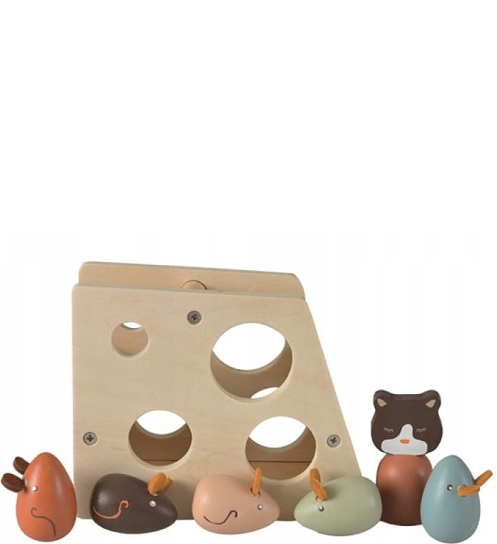 Dopasuj odpowiedni otwór dla myszek i kota. Zabawka rozwija spoztrezgawczość, logiczne myślenie i koordynacje reka- oko. Ekologiczny i bezpieczny sposób zabawy dla najmłodszych