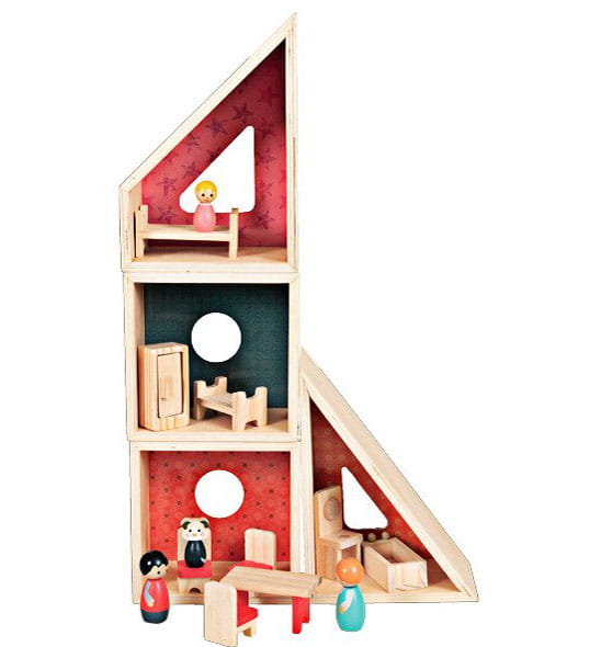 Domek dla lalek składa się z trwałych, wytrzymałych, kolorowych, drewnianych elementów.