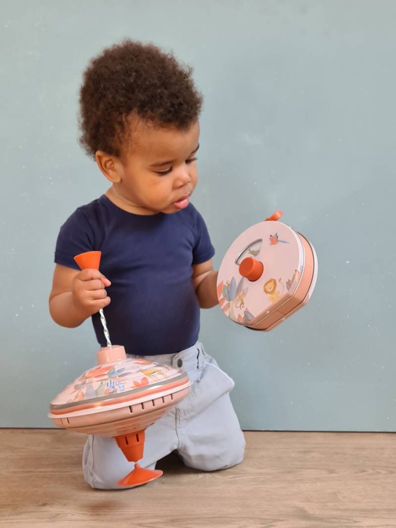 Kręcący się dookoła siebie, wydający dźwięki kolorowy przedmiot to wyjątkowo interesująca zabawka muzyczna dla maluchów.