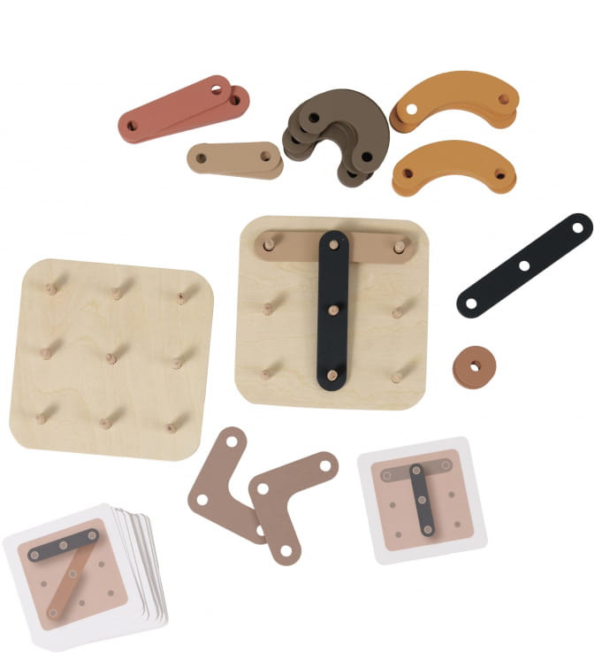 Zabawka ta ma na celu rozwijanie zręczności manualnej u dzieci poprzez układanie na drewnianej planszy z kołeczkami elementów tak, aby rysunek zgadzał się z tym wylosowanym z talii kart.