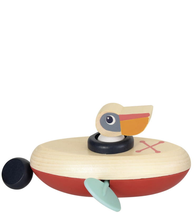 Łódka jest wyposażona w nakręcany mechanizm, który pozwala jej poruszać się po tafli wody, napędzana wesołym uśmiechem i energią malutkiego pelikana, który pełni rolę kapitana tej małej łodzi. Jego wyrazista twarz i kolorowa sylwetka sprawiają, że łódka nabiera jeszcze większego uroku.