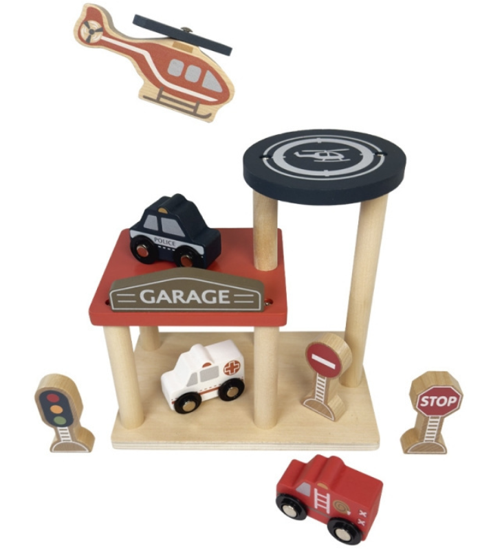Zestaw zawiera wszystkie pojazdy, które są potrzebne do przeprowadzenia własnej akcji ratunkowej przestronny garaż oraz cztery pojazdy – samochód policyjny, karetka pogotowia, wóz strażacki i helikopter. Każdy pojazd jest starannie wykonany z drewna, co zapewnia trwałość i bezpieczeństwo. Dzieci mogą wyobrażać sobie różne scenariusze i przygody związane z samochodami zostając bohaterami dzięki pomocy w akcji ratowniczej. Pomaga to w nauce o zawodach związanych z pomocą i ratowaniem życia, doskonale wpływa na koordynację ręka-oko,