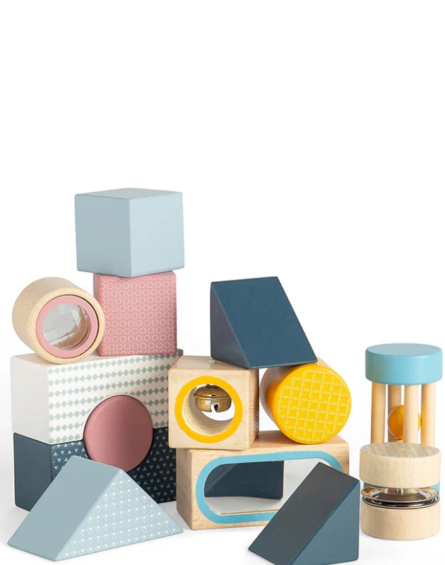 Zestaw klocków sensorycznych dla dzieci składa się z dużych klocków w różnych kształtach i kolorach. Wśród nich znajdują się elementy, które stymulują rozwój poznawczy maluszka, takie jak: