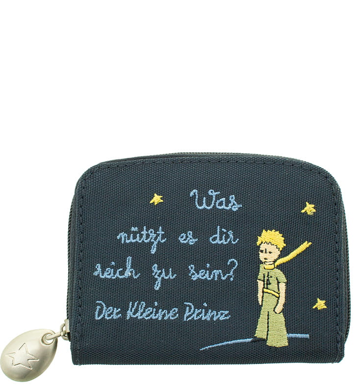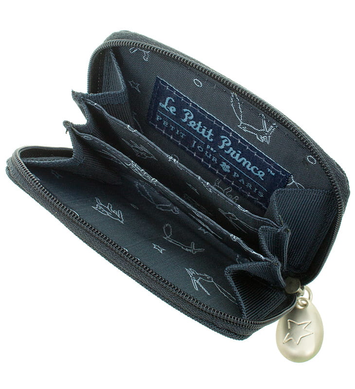 Usztywniany, zamykany na zamek portfel trzykomorowy. Wnętrze obszyte podszewką z motywem postaci z opowiadania Le Petit Prince (Mały Książę). Portfelik wyposażony jest w w trzy przegródki na karty lub banknoty. Zamykany ozdobnym suwakiem. Czyszczenie: nie prasować , nie suszyć w suszarkach, przetrzeć wilgotną gąbką z odrobiną detergentu.