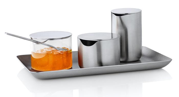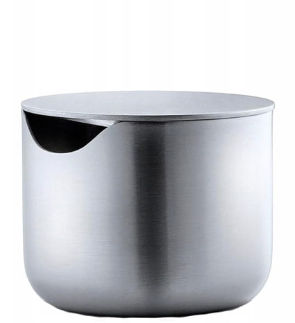 Pojemniczek na cukier wykonany jest w całości ze szczotkowanej stali nierdzewnej i zabezpieczony przez zabrudzeniem zawartości wieczkiem. Otwór w przedniej części pozwala wygodnie włożyć łyżeczkę (zestaw jej nie zawiera).