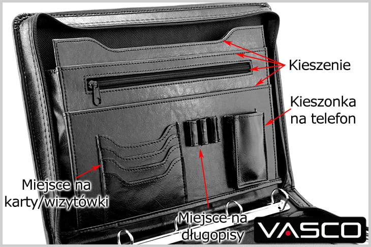 - szeroka przegroda na dokumenty, oraz trzy wąskie w tym jedna zamykana na zamek.