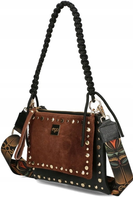 Stylowa torebka z najnowszej kolekcji EGO Totemic. Elegancka skórzana torebka ze skóry naturalnej łączonej z zamszową, zamykana jest na zamek błyskawiczny i posiada 2 komory oraz jedną zamykaną zameczkiem kieszonkę. Torebka jest złożona z 2 oddzielnych odpinanych komór .Torebka posiada 1 średniej długości pleciony uchwyt, skórzany wąski regulowany odpinany pasek oraz długi również odpinany szeroki pasek który pozwala przekształcić torebkę w elegancką listonoszkę. Bardzo elegancki średniej wielkości model torebki, do której zmieści się notatnik formatu A5, telefon, portfel i klucze.