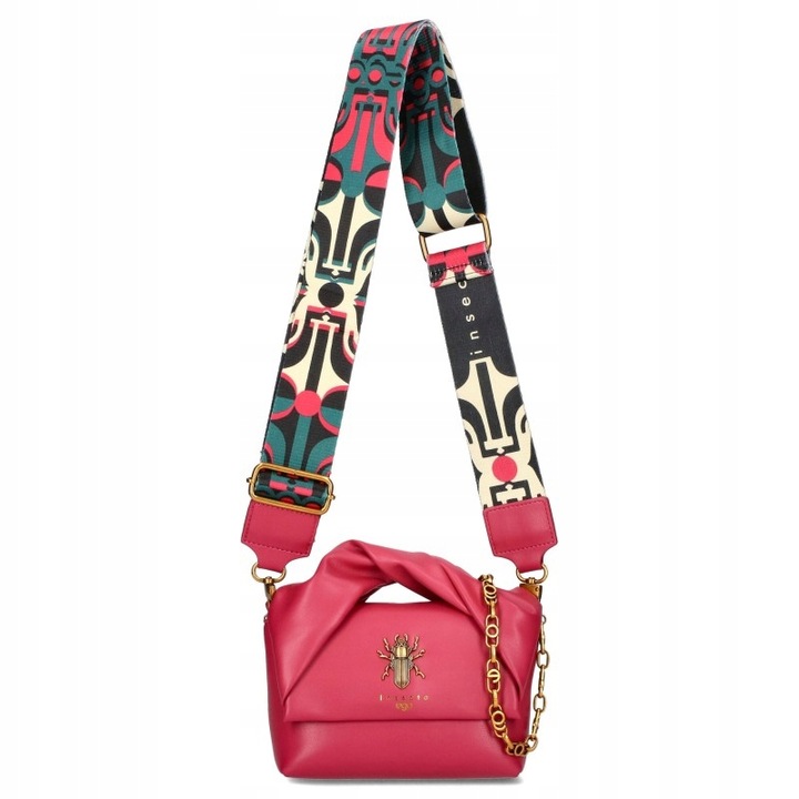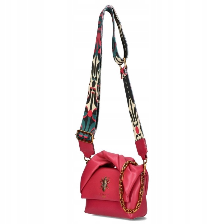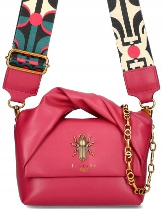 Niewielka, miękka torebka z najnowszej kolekcji EGO. Torebka- listonoszka z miękkiej i bardzo miłej w dotyku skóry syntetycznej zamykana jest na zamek błyskawiczny i zabezpieczona klapką z zamkiem magnetycznym. Listonoszka EGO posiada jedną komorę oraz 1 kieszonkę wewnętrzną. Torebka posiada 2 paski: krótki pleciony łańcuszek o długości przybliżonej około 60 cm oraz długi odpinany szeroki pasek który pozwala przekształcić torebkę w elegancką listonoszkę. Bardzo oryginalny, średniej wielkości model torebki mieści telefon, portfel i klucze. Torebki jest oryginalny zawijamy uchwyt złoty logotyp oraz skarabeusz.