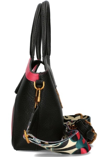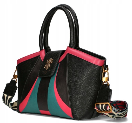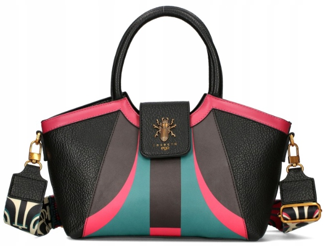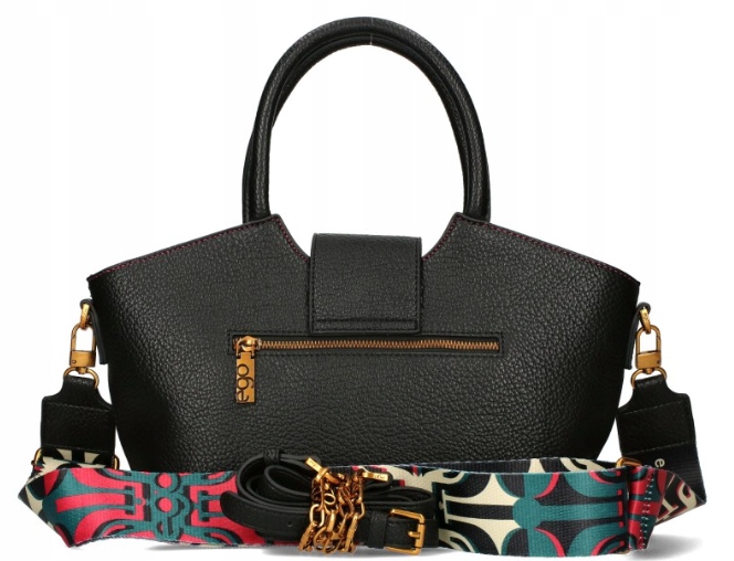 Torebka marki Ego z najnowszej kolekcji Deltica, to jednokomorowa torebka z wewnętrzną zamykaną kieszonką. Z przodu torebki oraz ozdobny skarabeusz. Tył torebki gładki z kieszonką. Torebka zamykana zamkiem błyskawicznym. Posiada krótkie rączki do noszenia w dłoni oraz dopinany materiałowy pasek w print. Można ją założyć zarówno do sukienki, jak i codziennej stylizacji.