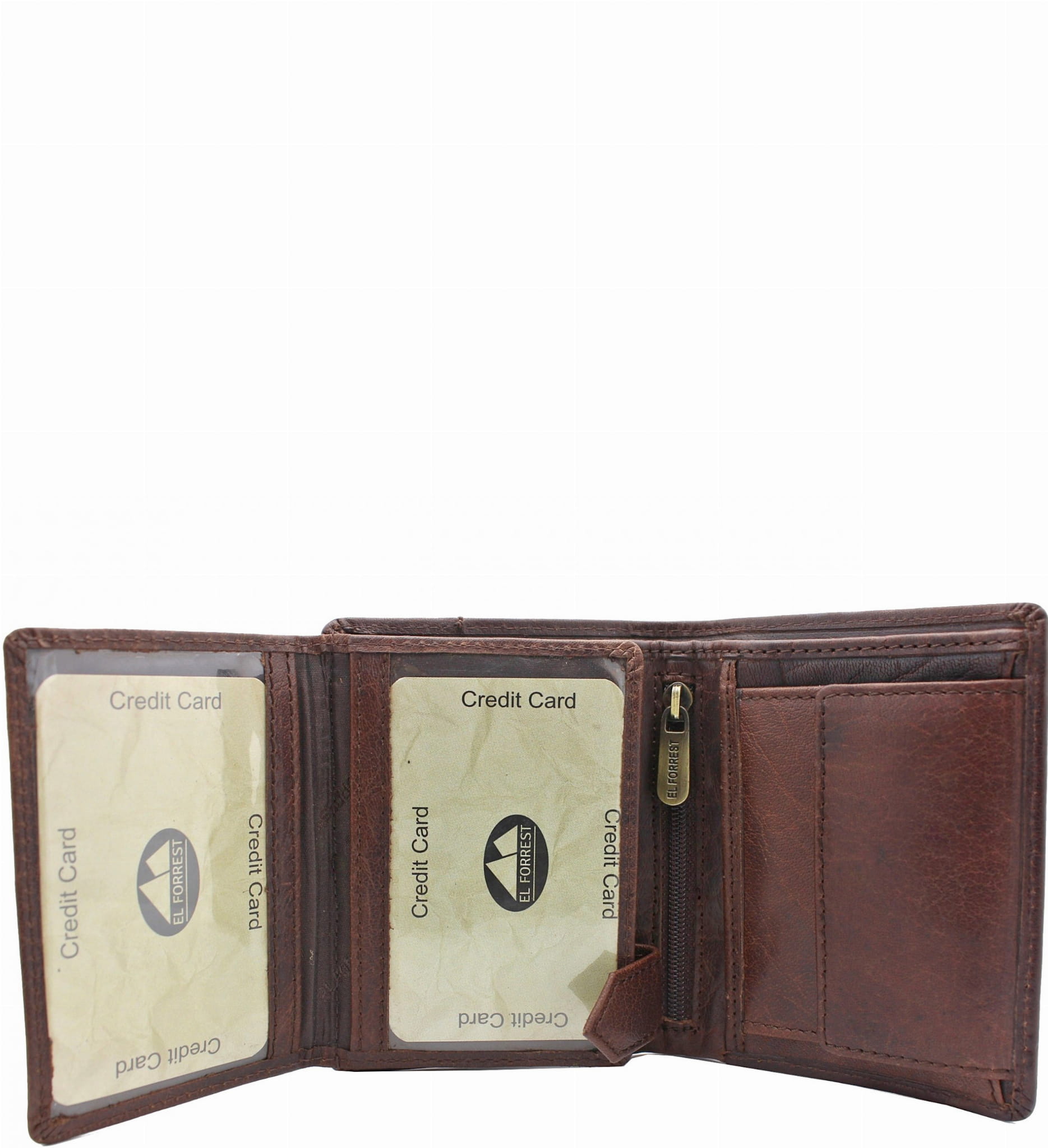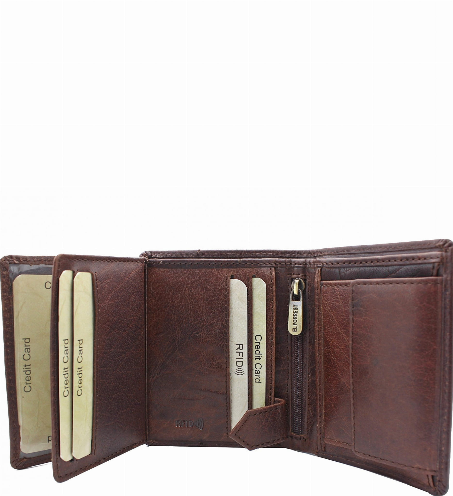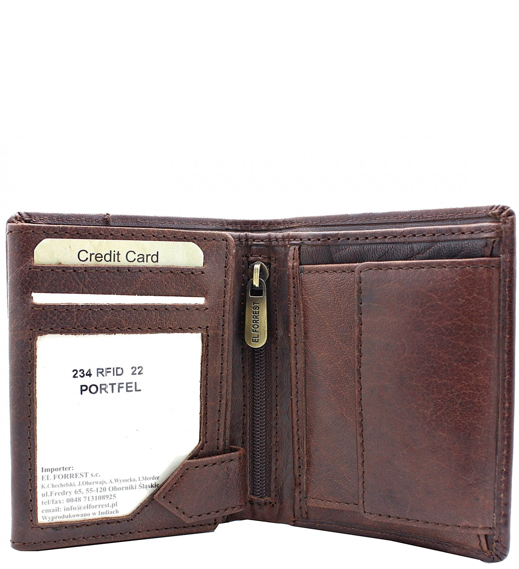 Mały portfel ElForrest podzielony jest na dwie części- jedna z nich to duża kieszonka na bilon zamykana na zatrzask, druga część przeznaczona jest do przechowywania kart płatniczych, lojalnościowych, dokumentów etc. Portfel ElForrest posiada obszerną przegrodę na banknoty. Część przeznaczona na karty zamykana jest i zabezpieczona zatrzaskowym zapięciem. Portfel ma zabezpieczenie systemem RFID