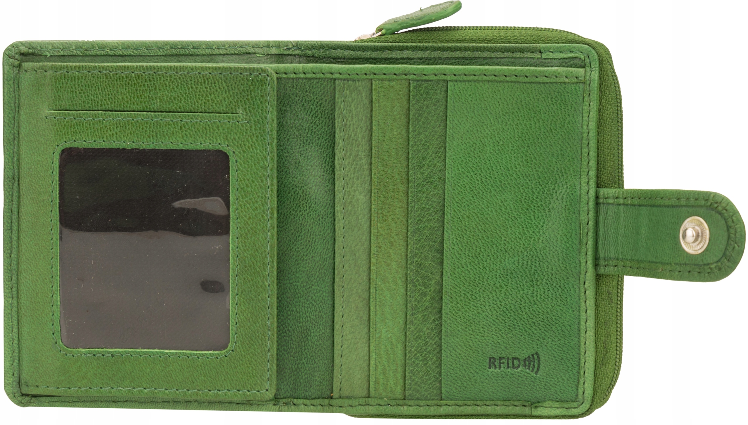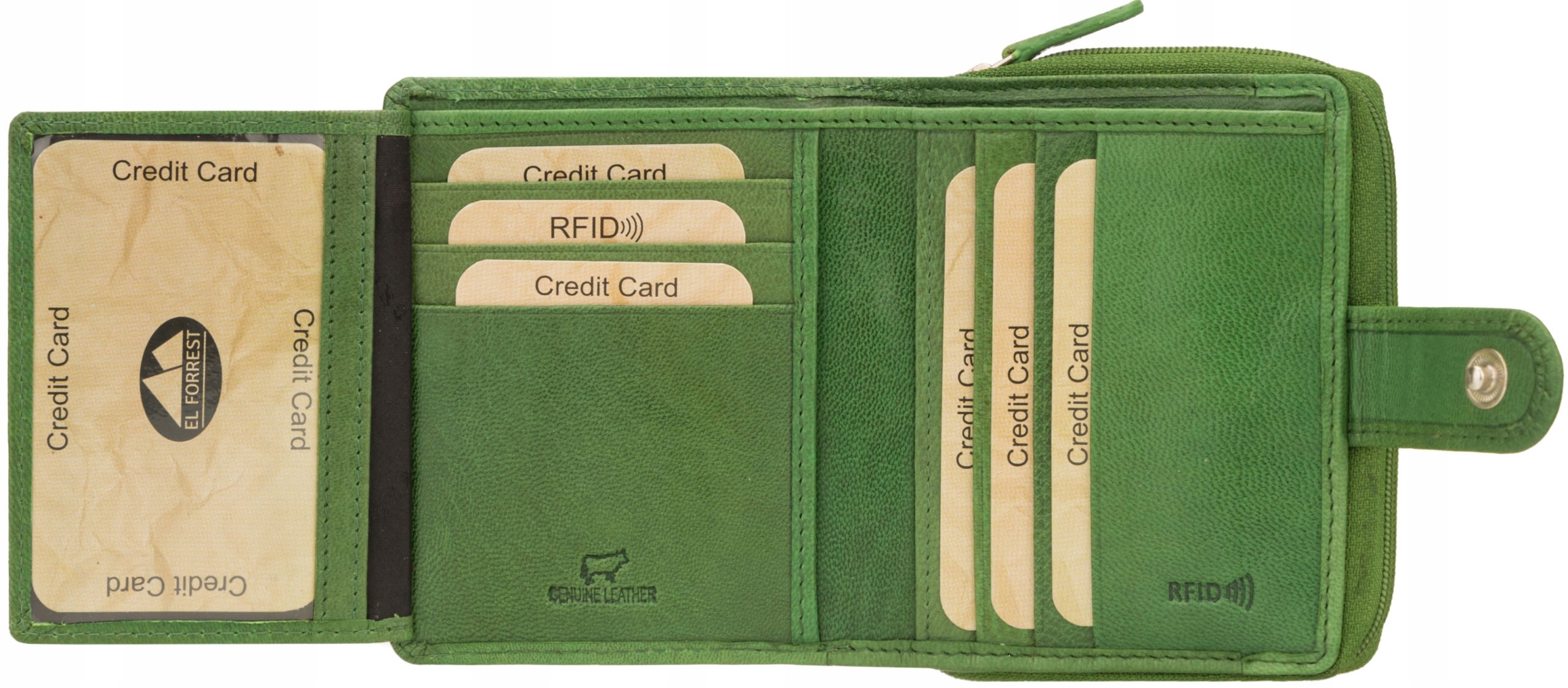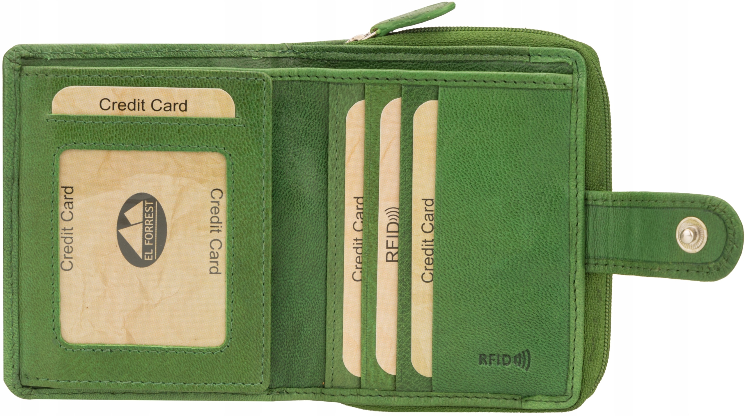 Mały, zamykany zamkiem błyskawicznym i zatrzaskiem portfel damski ElForrest podzielony jest na dwie części- jedna z nich to obszerna, podwójna kieszeń na bilon zamykana na zamek błyskawiczny, druga, rozbudowana część przeznaczona jest do przechowywania kart płatniczych, lojalnościowych, dokumentów, banknotów etc. Portfel ElForrest posiada obszerną, podwójną przegrodę na banknoty. Część przeznaczona na karty zamykana jest i zabezpieczona zatrzaskowym zapięciem. Portfel ma zabezpieczenie systemem RFID