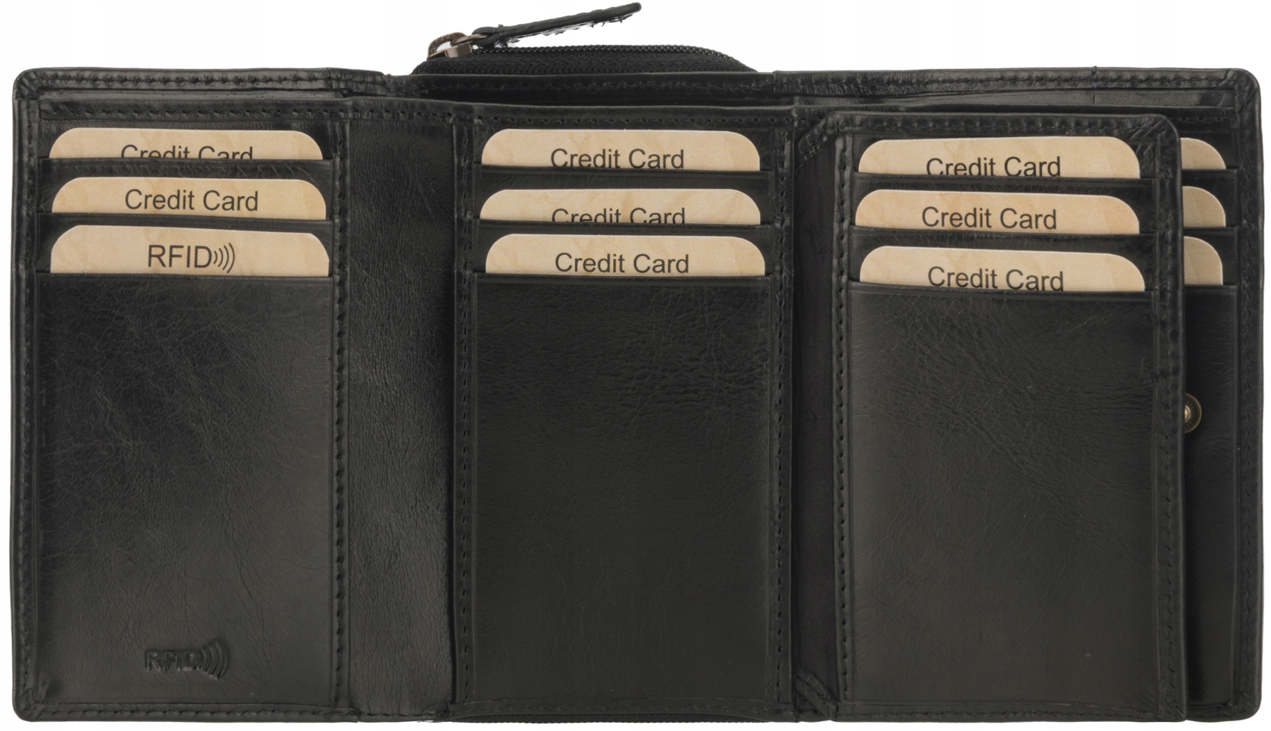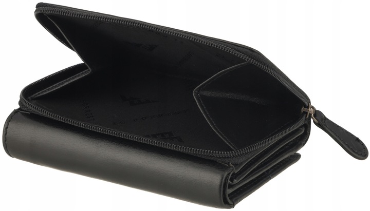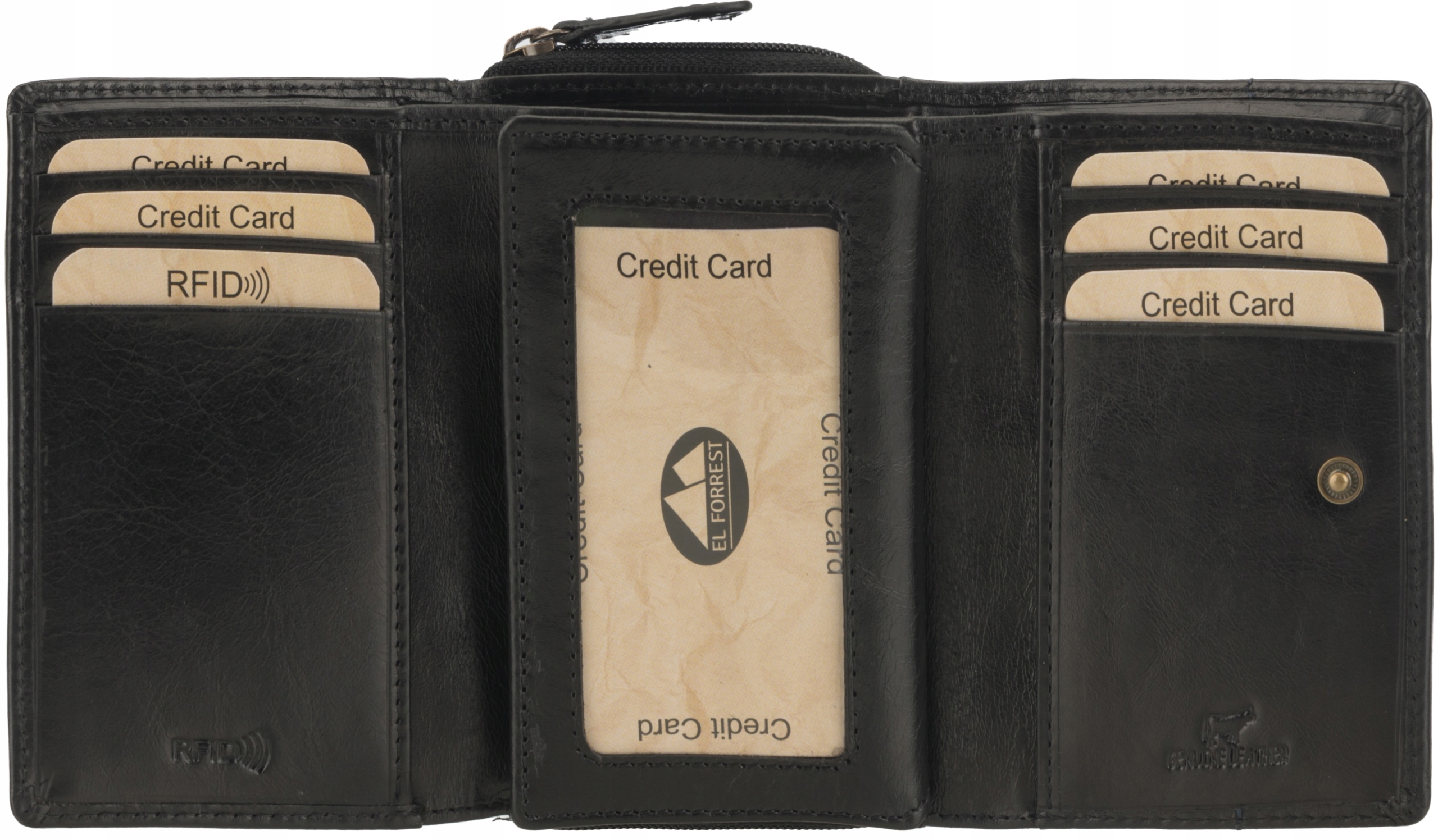 Mały, lekki, pojemny portfel damski El FOrrest, zamykany jest z jednej strony na zatrzask, druga część przeznaczona na bilon zamykana jest na zamek błyskawiczny. Portfel damski El FOrrest ma rozbudowana część na katy i banknoty; zawiera ona aż 12 miejsc na karty lub dokumenty, 4 kieszonki uniwersalne i podwójną przegrode na banknoty.
