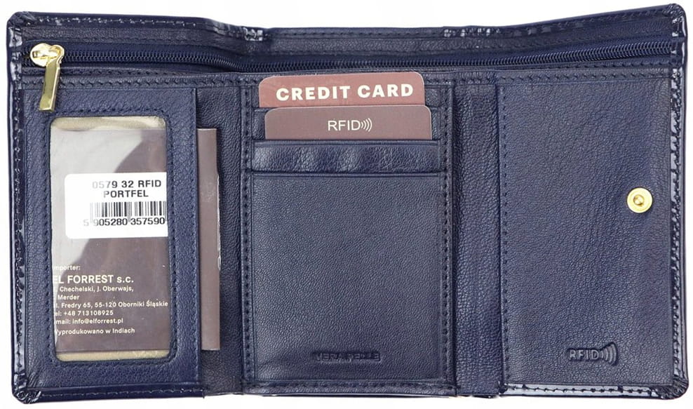 Mały, lekki, pojemny portfel damski El FOrrest, zamykany jest z jednej strony na zatrzask, druga część przeznaczona na bilon zamykana jest na bigiel. Portfel damski El FOrrest ma rozbudowana część na katy i banknoty; zawiera ona 3 miejsca na karty lub dokumenty, 3 kieszonki uniwersalne, w tym jedną półprzeźroczystą na zdjęcia, potrójną przegrodę na banknoty (w tym jedna kieszeń zamykaną suwakiem).