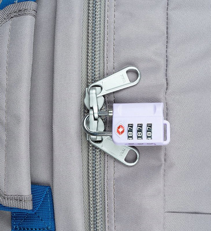 Do plecaków i toreb Cabinzero stosuje się najlepsze i najbardziej solidne zamki japońskiej firmy YKK. Dwustronne zamki tworzone i mocowane są tak, aby można było zamknąć je kłódką (nie jest dołączona do plecaka) i w ten sposób zwiększyć bezpieczeństwo bagażu.