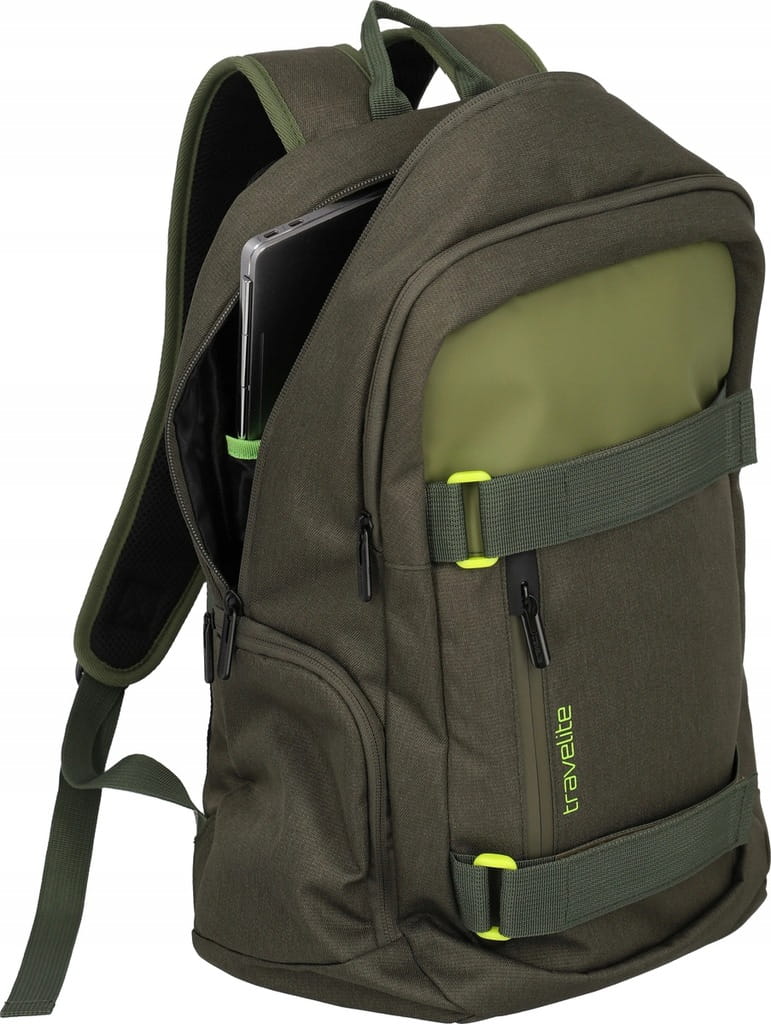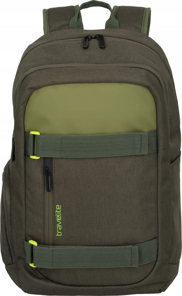 Funkcjonalny dwukomorowy plecak Travelite zamykany zamkiem błyskawicznym, wykończony jest trwałą podszewką. Z przodu umieszczono pionową kieszeń zamykaną na suwak. Wewnątrz komory głównej plecak Travelite wyposażony jest w bezpieczną kieszeń na laptopa kieszeń na notebooka oraz kieszonkę zamykaną na suwak. Po obu bokach plecaka znajdują się 2 kieszonki – otwarta na butelkę wody i zamykana suwakiem na cenniejsze przedmioty. Z tyłu plecak Travelite wyposażony jest w bezpieczną kieszonkę na cenne przedmioty, zamykaną na suwak. Plecak Travelite zawiera elementy odblaskowe dla poprawy bezpieczeństwa. z tyłu plecaka umieszczony jest pas służący do zamocowania plecaka na stelażu walizki. Do przenoszenia plecaka służą 2 regulowane miękkie i wygodne szelki połączone pasem piersiowym oraz uchwyt zamocowany w górnej części bagażu
