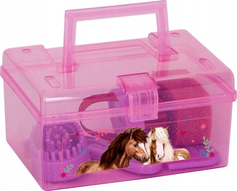 Błyszczące pudełko z uroczym motywem koni wykonane jest z trwałego plastiku i dzięki kompaktowym wymiarom (ok. 14 × 10 × 7 cm) idealnie nadaje się do przechowywania wszystkich akcesoriów pielęgnacyjnych – zarówno w domu, jak i w podróży. Solidne zamknięcie sprawia, że wszystkie elementy są bezpiecznie przechowywane i zawsze pod ręką.