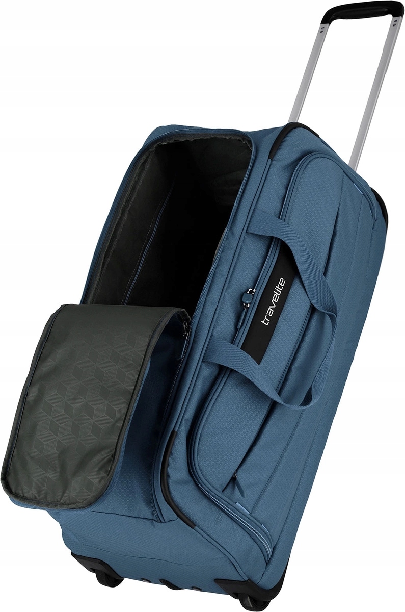 Dwa stabilne kółka i wygodne uchwyty – górny oraz frontowy – umożliwiają łatwe prowadzenie torby i szybkie przenoszenie w różnych sytuacjach. Wnętrze o pojemności 63 litrów wyposażono w organizer na drobne przedmioty oraz komorę zamykaną na suwak, co ułatwia utrzymanie porządku podczas pakowania.